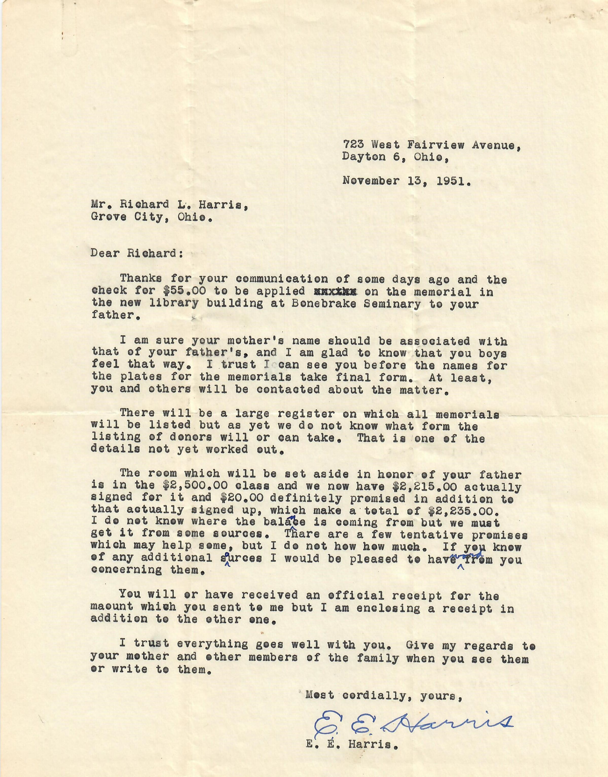 Thanks for your communication of some days ago and the check for $55.00 to be applied on the memorial in the new library at Bonebrake Seminary to your father.