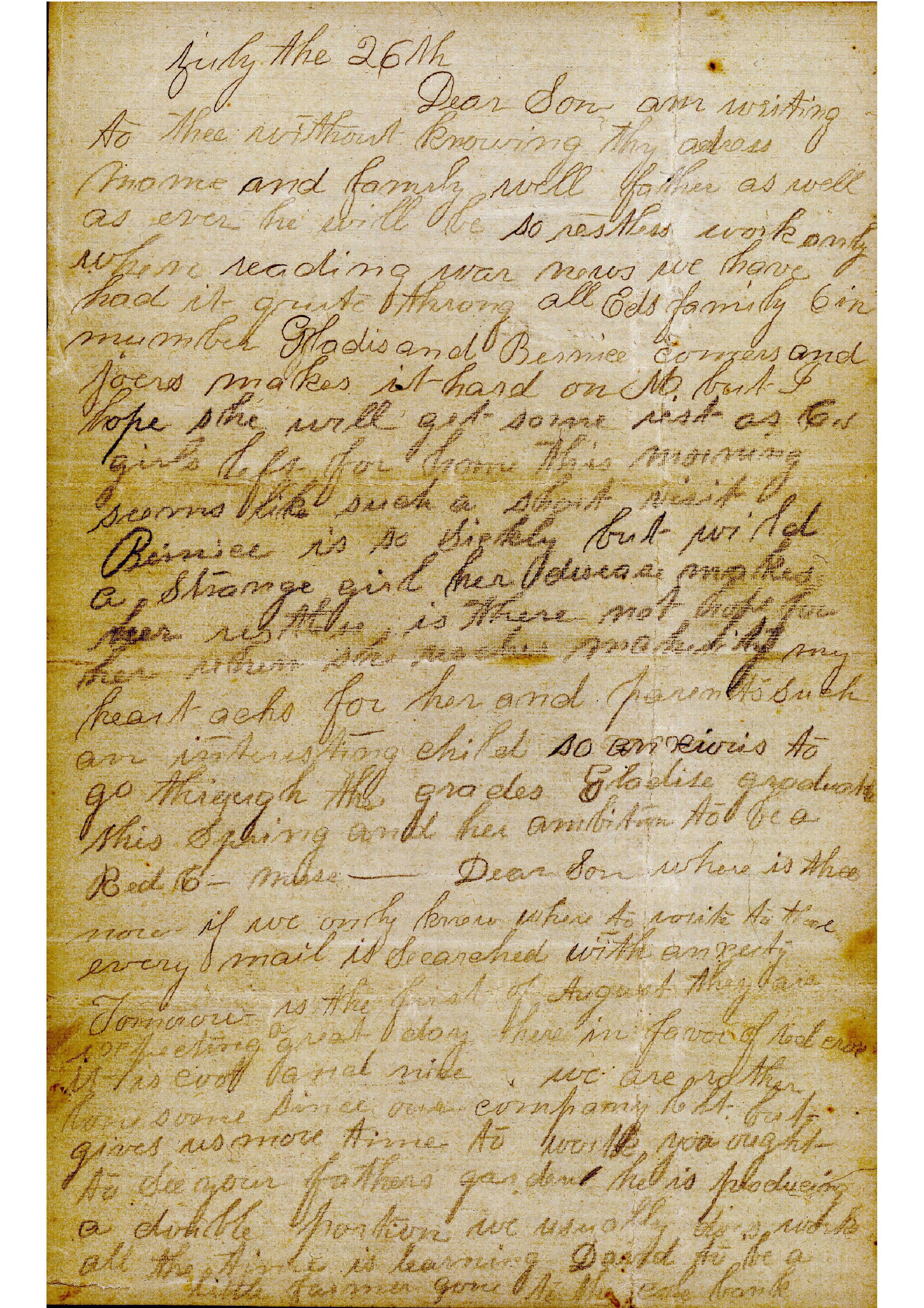 Bernies is so Sickly but wi[…] a stranger girl her disease makes her restess is Where not hope for her when she reaches […] my heart aches for her and parents Such an interesting child so anxious to go through the grades […]Gladise graduate this Spring and her ambition to be a Red C– nurse — Dear Son where is thee now if we only knew where to write to thee every mail is Searched with anxiety Tomorrow is the first of August they are expecting a great day here in favor of red cross it is cool and nice we are rather lonesome since our company left but gives us more time to work you ought to see your fathers garden he is producing a double portion we usually does work all the time is learning David to be a little farmer gone […] bank