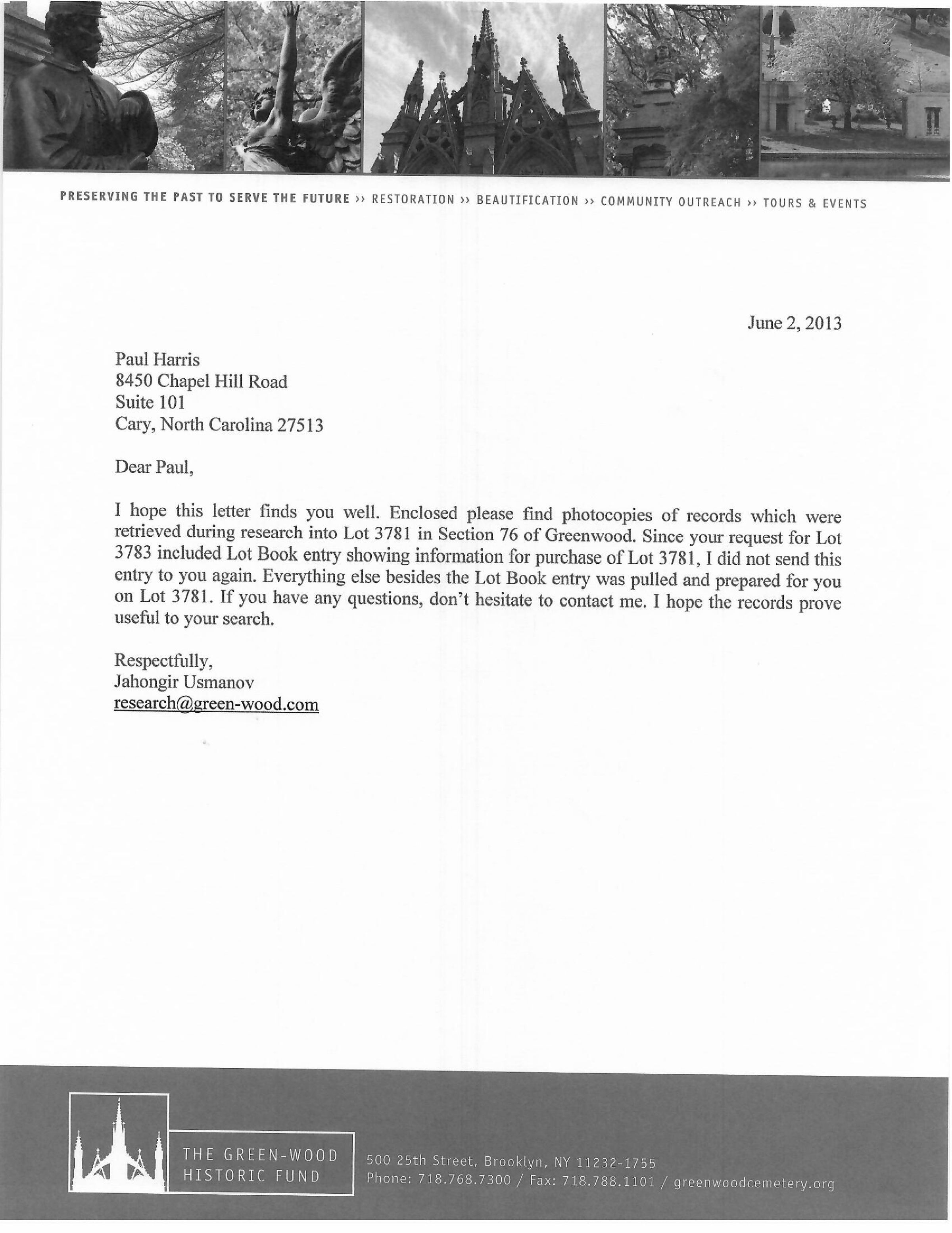 AU Green-Wood Cemetery, The - 2013-06-02 letter to Paul J. Harris Jr.Entry/Object ID