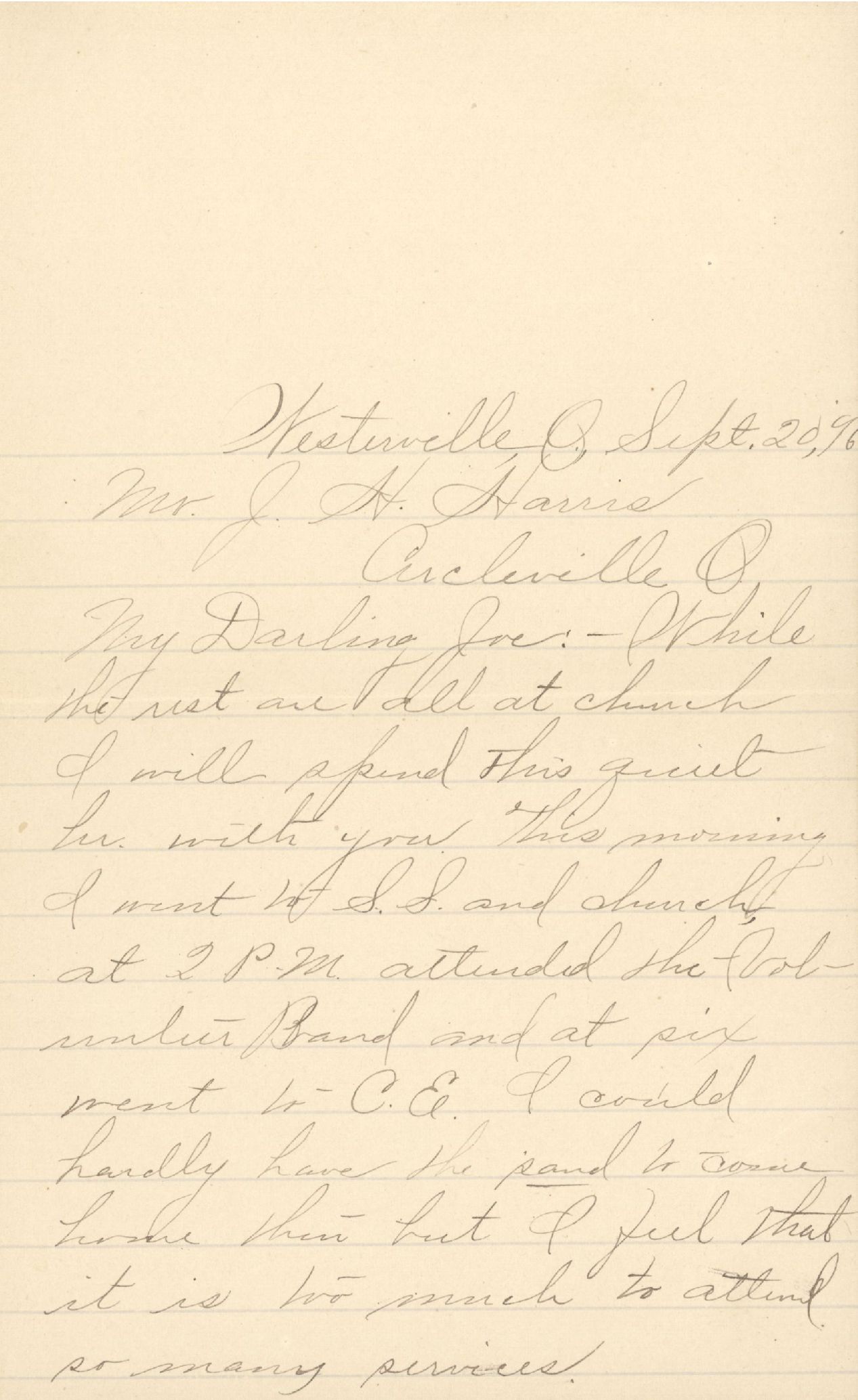My Darling Joe: — While the rest are all at church I will spend this quiet hr. with you. This morning I went to S.S. and church, at 2 P.M. attended the Volunteer Band and at six went to C.E. I could hardly have the sand to come home then but I feel that it is too much to attend so many services.