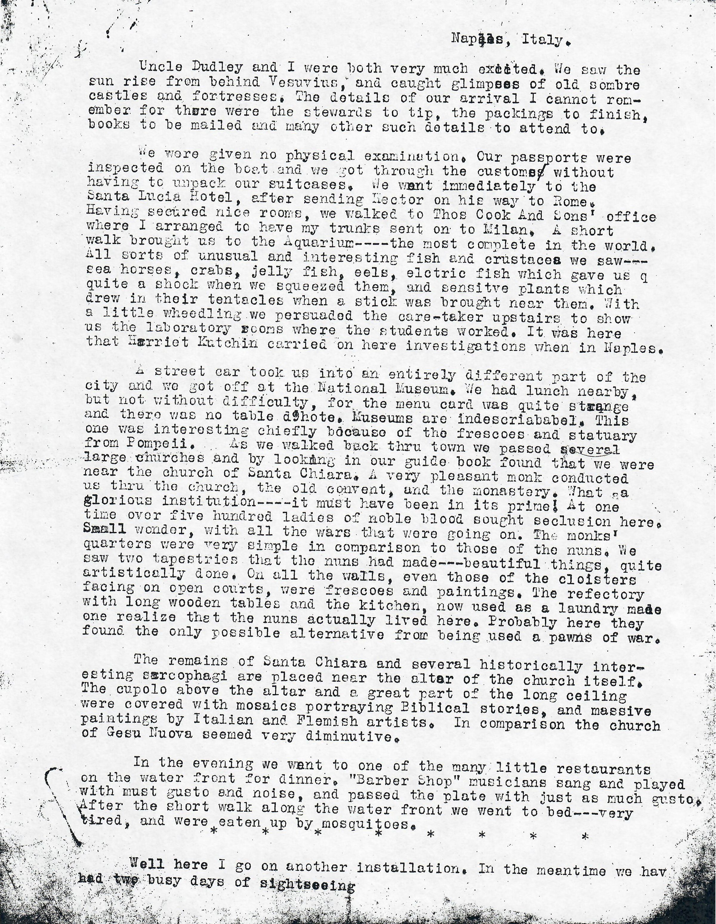 We were given no physical examination. Our passports were inspected on the boat and we got through the customs without having to unpack our suitcases. We went immediately to the Santa Lucia Hotel, after sending Hector on his way to Rome. Having secured nice rooms, we walked to Thos Cook And Sons’ office where I arranged to have my trunks sent on to Milan. A short walk brought us to the Aquarium----the most complete in the world. All sorts of unusual and interesting fish and crustaces we saw---sea horses, crabs, jelly fish, eels, electric fish which gave us quite a shock when we squeezed them, and sensitive plants which drew in their tentacles when a stick was brought near them. With a little wheedling we persuaded the care-taker upstairs to show us the laboratory rooms where the students worked. It was here that Harriet Kutchin carried on her investigations when in Naples.