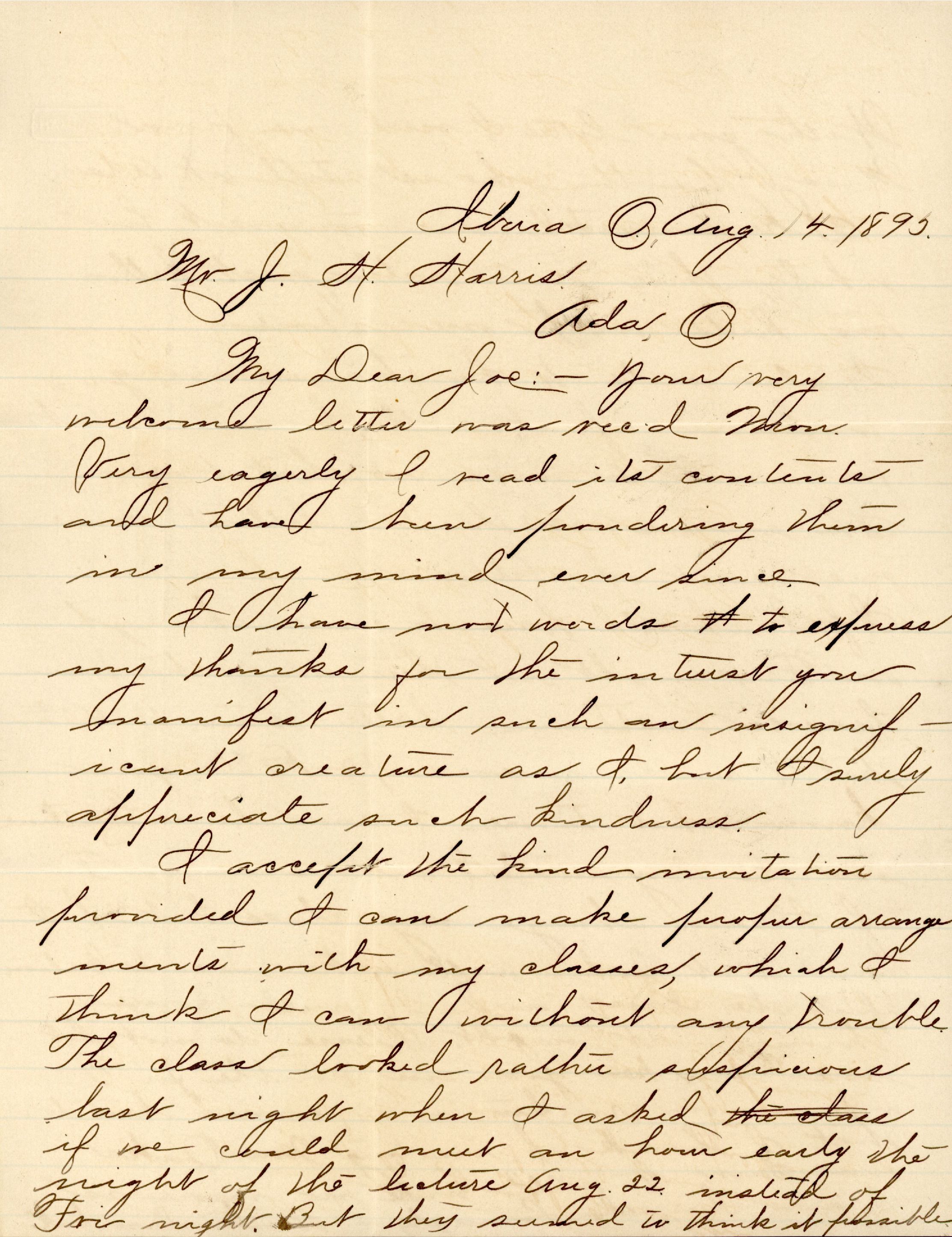 [Iberia, OH, to Mr. J. H. Harris, Ada, Ohio, Lock Box 28]