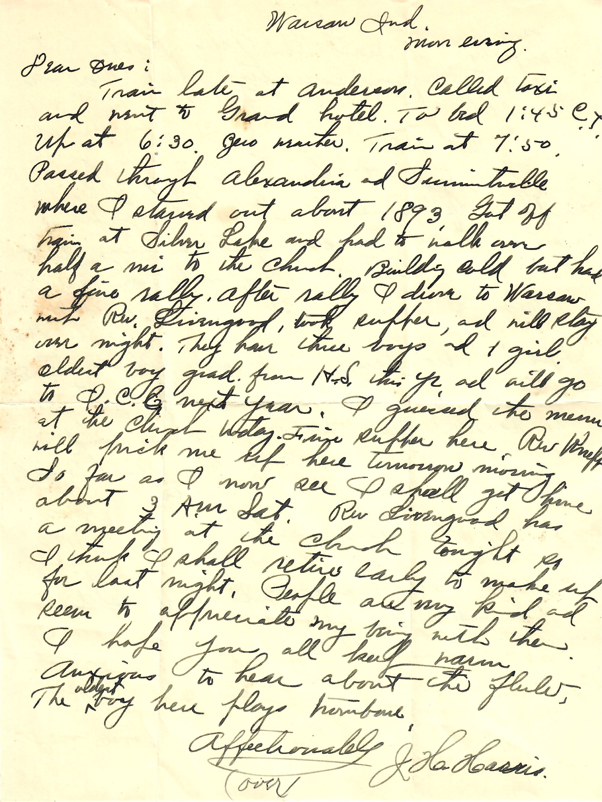 Train late at Anderson. Called taxi and went to Grand hotel. To bed 1:45 C.T. Up at 6:30. Zero weather. Train at 7:50. Passed through Alexandria and Summitville where I [started] out about 1893. Got off train at Silver Lake and had to walk over half a mi to the church. Building cold but had a fine rally. After rally I drove to Warsaw with Rev. [Livengood,] took supper and will stay over night. They have three boys and one girl. Oldest boy graduated from H.S. this yr. and will go to I.C.C. next year. I guessed the menu at the church today. Fine supper here. Rev. Kneff will pick me up here tomorrow morning. So far as I now see I shall get home about 3 A.M. Sat. Rev. Livengood has a meeting at the church tonight so I think I shall retire early to make up for last night. People are very kind and seem to appreciate my being with them. I hope you all keep warm. Anxious to hear about the flute. The oldest boy here plays trombone.