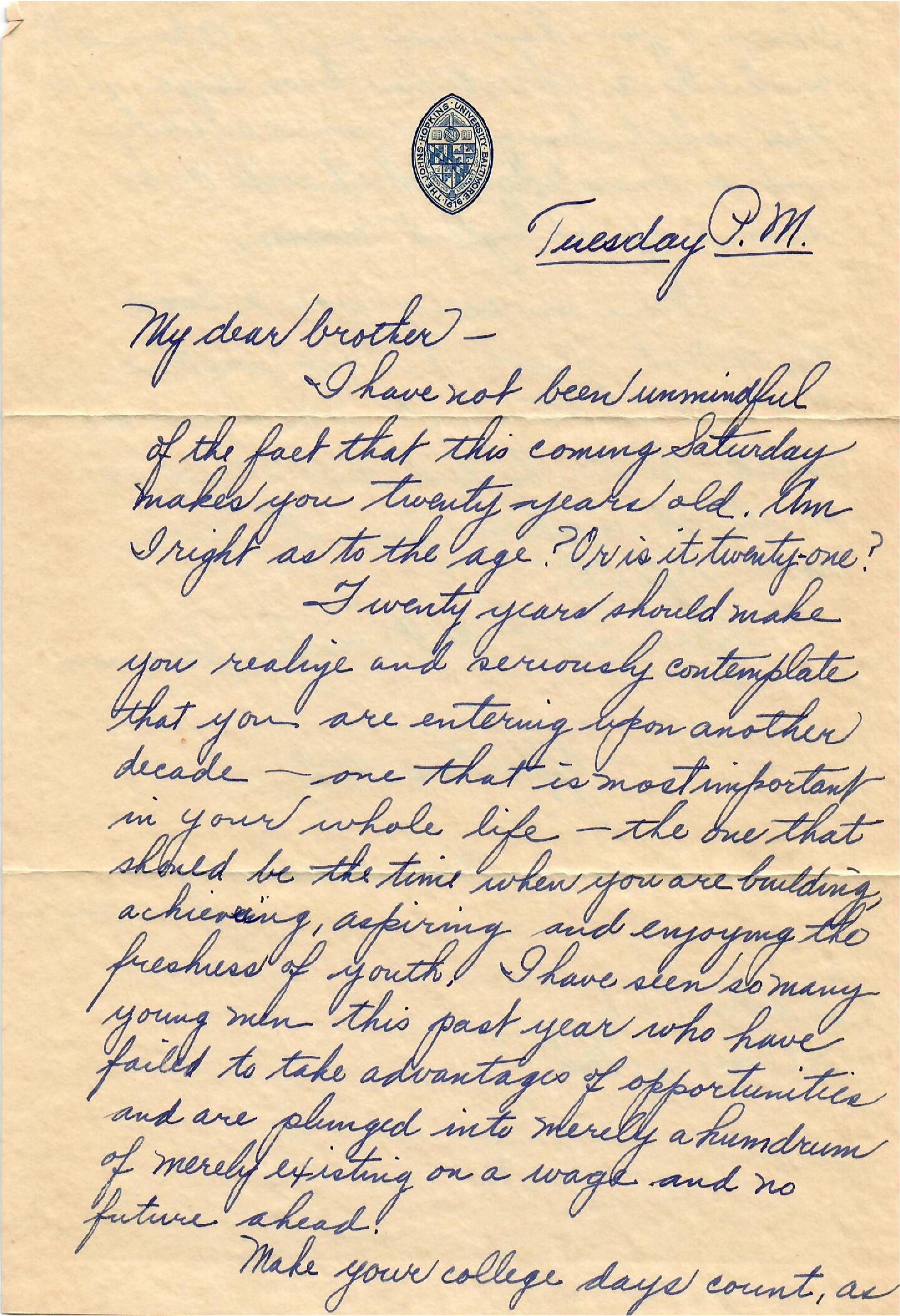Twenty years should make you realize and seriously contemplate that you are entering upon another decade — one that is most important in your whole life — the one that should be the time when you are building, achieving, aspiring and enjoying the freshness of youth. I have seen so many young men this past year who have failed to take advantage of opportunities and are plunged into merely a humdrum of merely existing on a wage and not future ahead.
