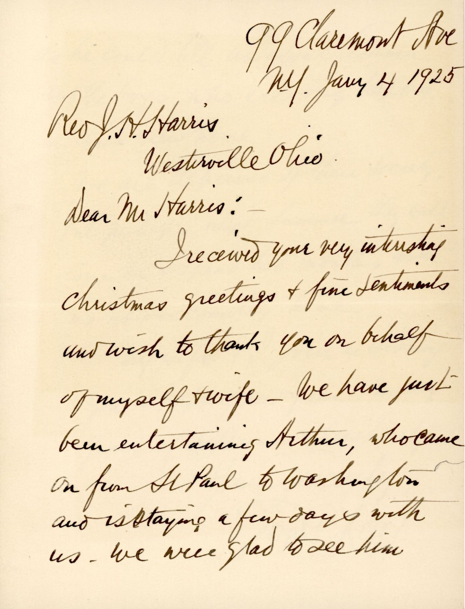 I received your very interesting Christmas greetings & fine sentiments and wish to thank you on behalf of myself & wife - We have just been entertaining Arthur, who came on from St. Paul to Washington and is staying a few days with us. We were glad to see him as he could tell us about Emma and the boys, who are very happy in their new home.