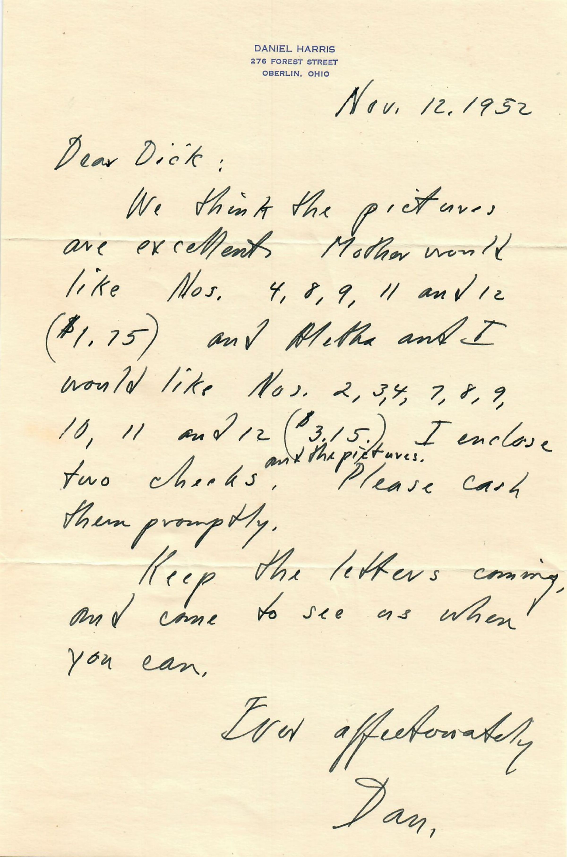 We think the pictures are excellent. Mother would like Nos. 4, 8, 9, 11 and 12 ($1.75) and Aleltha and I would like Nos. 2, 3, 4, 7, 8, 9, 10, 11 and 12 ($3.15.) I enclose two checks and the pictures. Please cash them promptly.