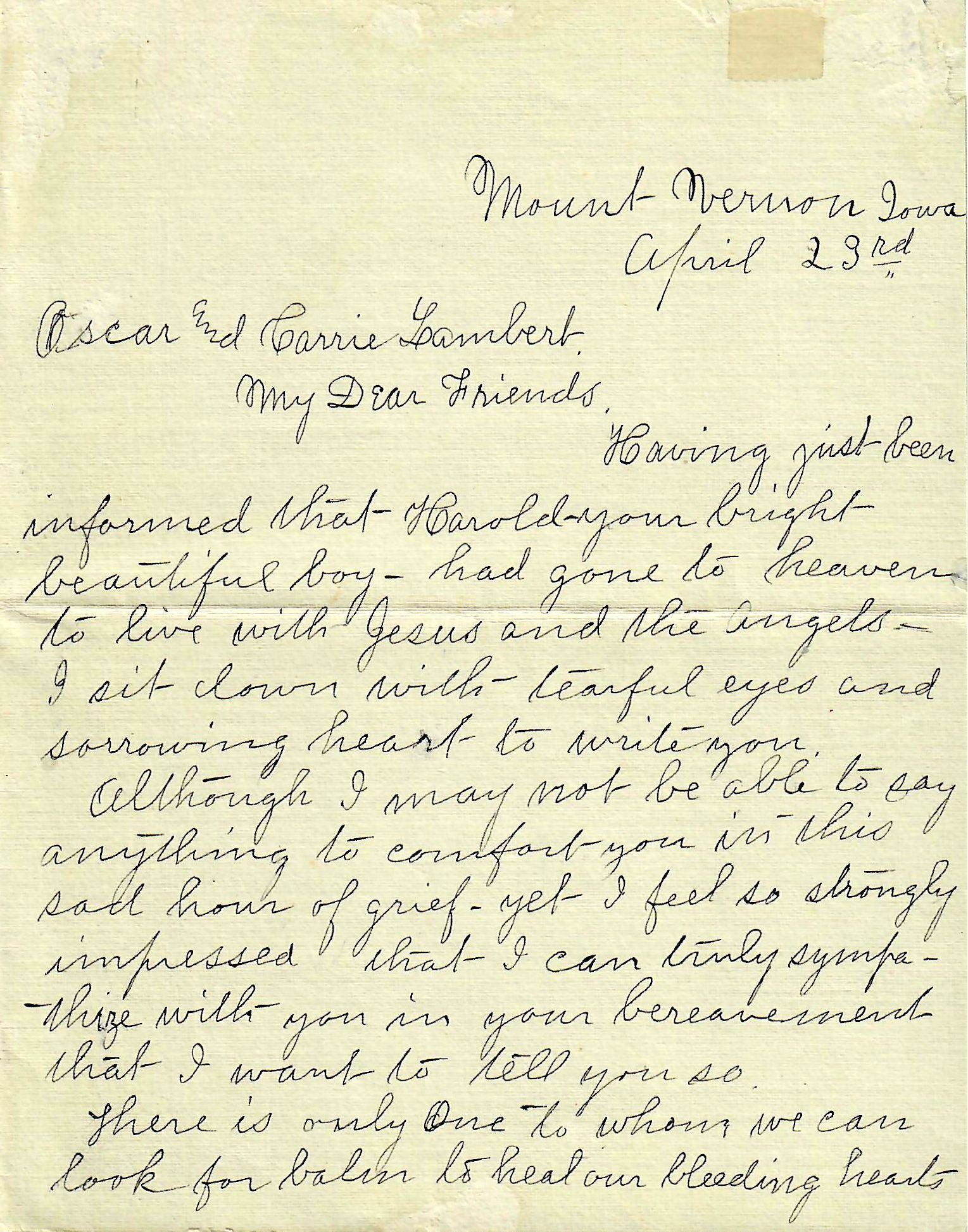Having just been informed that Harold - your bright beautiful boy - had gone to heaven to live with Jesus and the angels — I sit down with tearful eyes and sorrowing heart to write you.