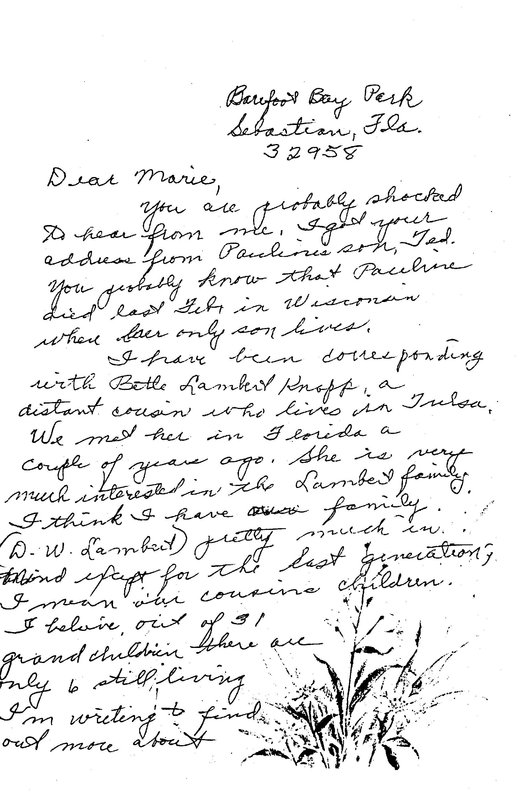 I have been corresponding with Bette Lambert Knapp, a distant cousin who lives in Tulsa. We met her in Florida a couple of years ago. She is very much in the Lambert family. I think I have our family (D. W. Lambert) pretty much in mind except for the last generation, I mean our cousins children. I believe out of 31 grand children there are only 6 still living. I'm writing to find out more about
