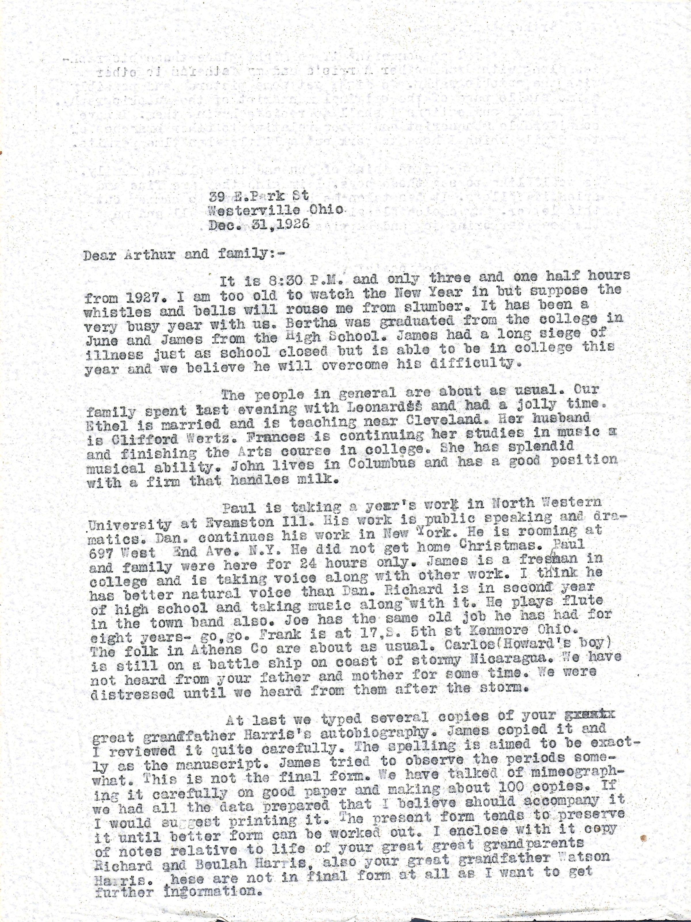 At last we typed several copies of your great grandfather Harris's autobiography. James copied it and I reviewed it quite carefully. The spelling is aimed to be exactly as the manuscript. James tried to observe the periods somewhat. This is not the final form. We have talked of mimeographing it carefully on good paper and making about 100 copies. If we had all the data prepared that I believe should accompany it I would suggest printing it. The present form tends to preserve it until better form can be worked out. I enclose with it copy of notes relative to life of your great great grandparents Richard and Beulah Harris, also your great grandfather Watson Harris. These are not final in form at all as I want to get further information.