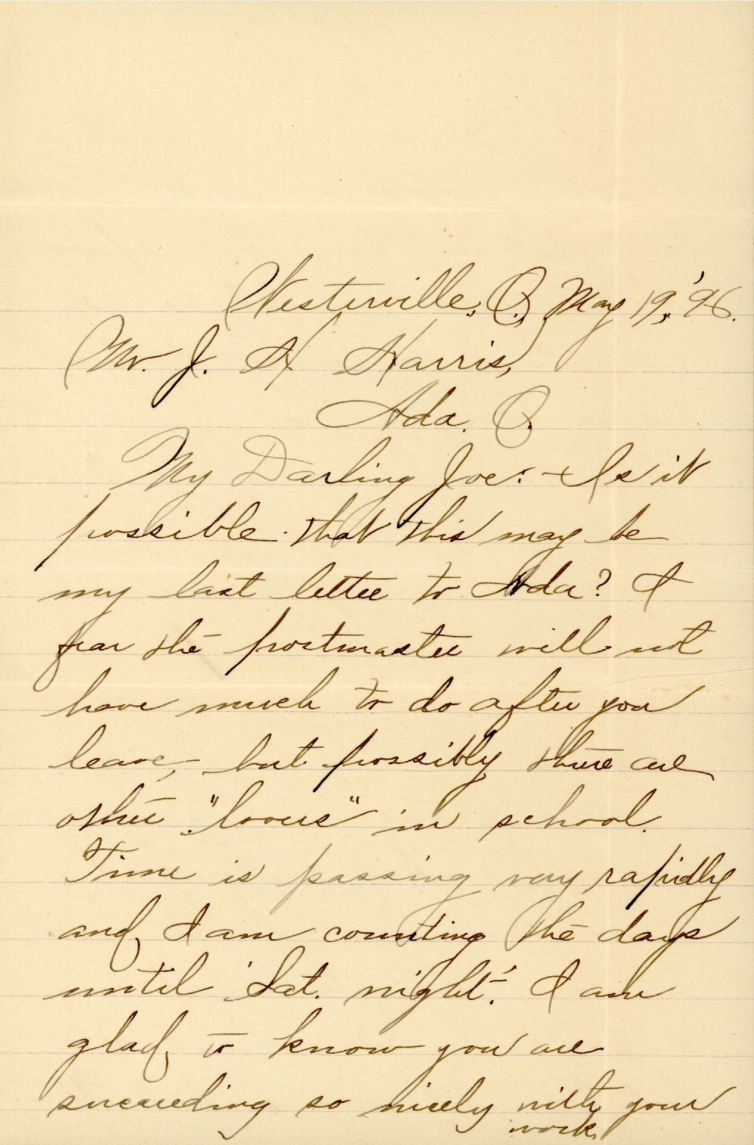 My Darling Joe: — Is it possible that this may be my last letter to Ada? I fear the postmaster will not have much to do after you leave, but possibly there are other “lover” in school.