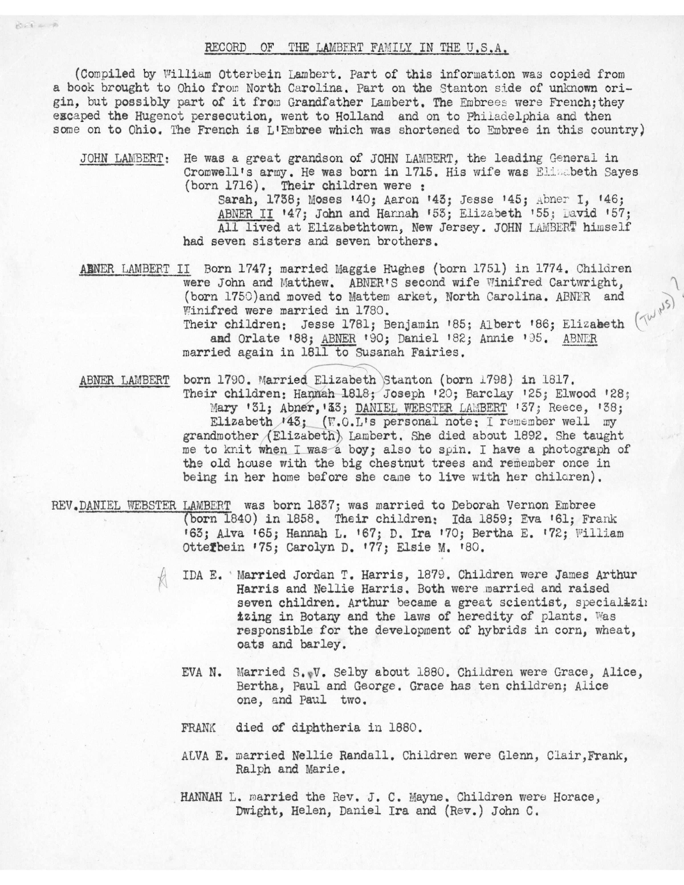 (Compiled by William Otterbein Lambert. Part of this information was copied from a book brought to Ohio from North Carolina. Part of the Stanton side of unknown origin, but possibly part of it from Grandfather Lambert. The Embrees were French; They escaped the Huguenot persecution, went to Holland (some went to England) and on to Philadelphia and then some on to Ohio. The French is L'Embree which was shortened to Embree in this country).