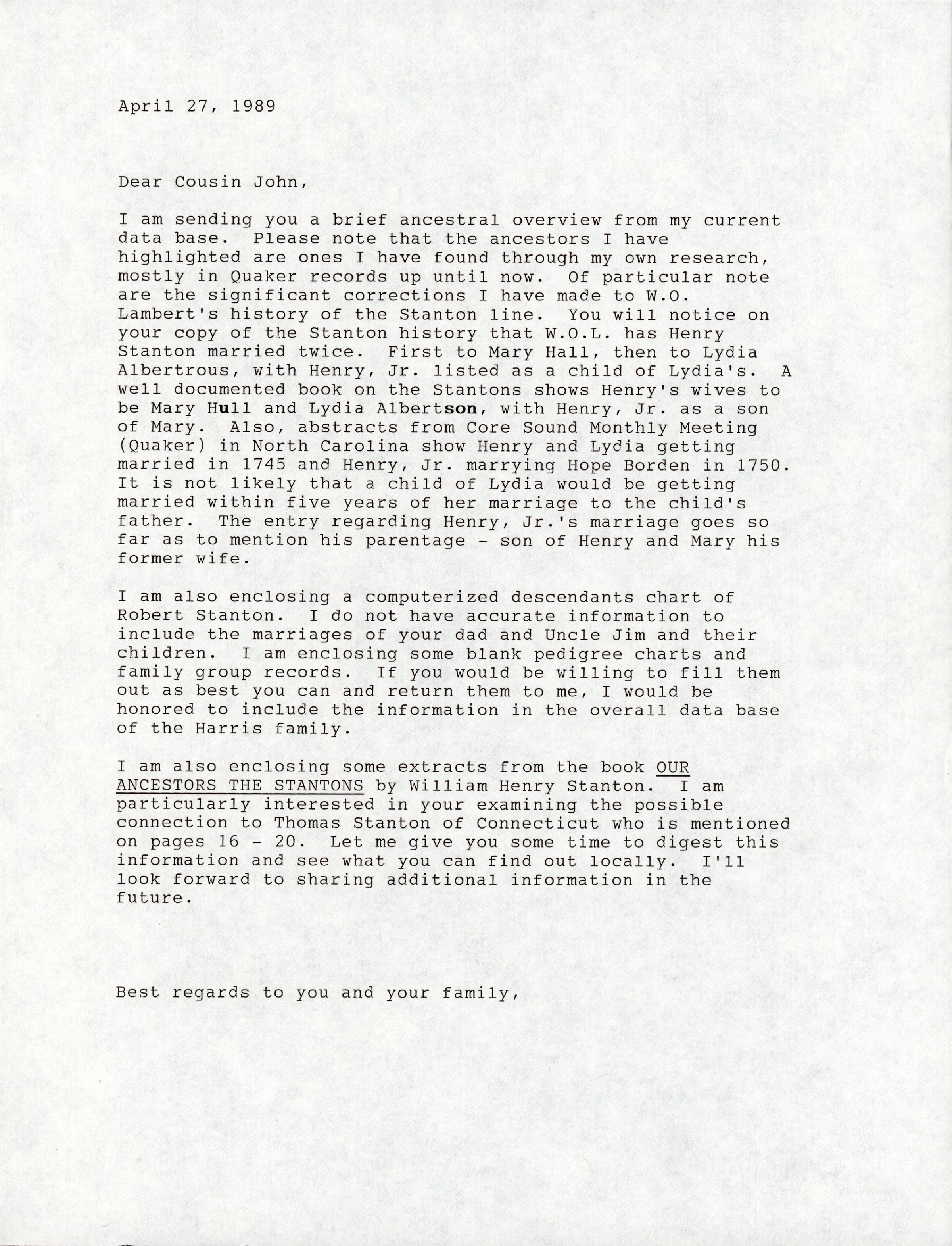 I am sending you a brief ancestral overview from my current data base. Please note that the ancestors I have highlighted are ones I have found through my own research, mostly in Quaker records up until now. Of particular note are the significant corrections I have made to W. O. Lambert's history of the Stanton line. You will notice on your copy of the Stanton history that W. O. L. has Henry Stanton married twice. First to Mary Hall, then to Lydia Albertrous, with Henry, Jr. listed as a child of Lydia's. A well documented book on the Stantons shows Henry's wives to be Mary Hull and Lydia Albertson, with Henry, Jr. as a son of Mary. Also, abstracts from Core Sound Monthly Meeting (Quaker) in North Carolina show Henry and Lydia getting married in 1745 and Henry, Jr. marrying Hope Borden in 1750. It is not likely that a child of Lydia would be getting married within five years of her marriage to the child's father. The entry regarding Henry, Jr.'s marriage goes so far as to mention his parentage - son of Henry and Mary his former wife.