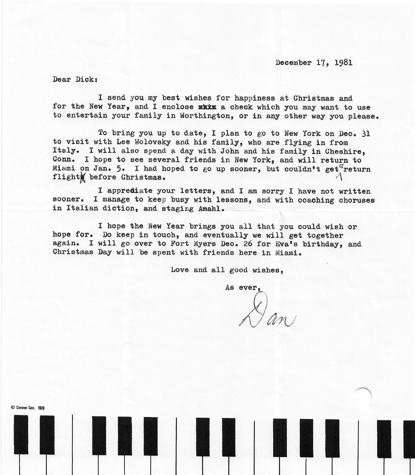 I appreciate your letters, and I am sorry I have not written sooner. I manage to keep busy with lessons, and with coaching choruses in Italian diction, and staging Amahl.