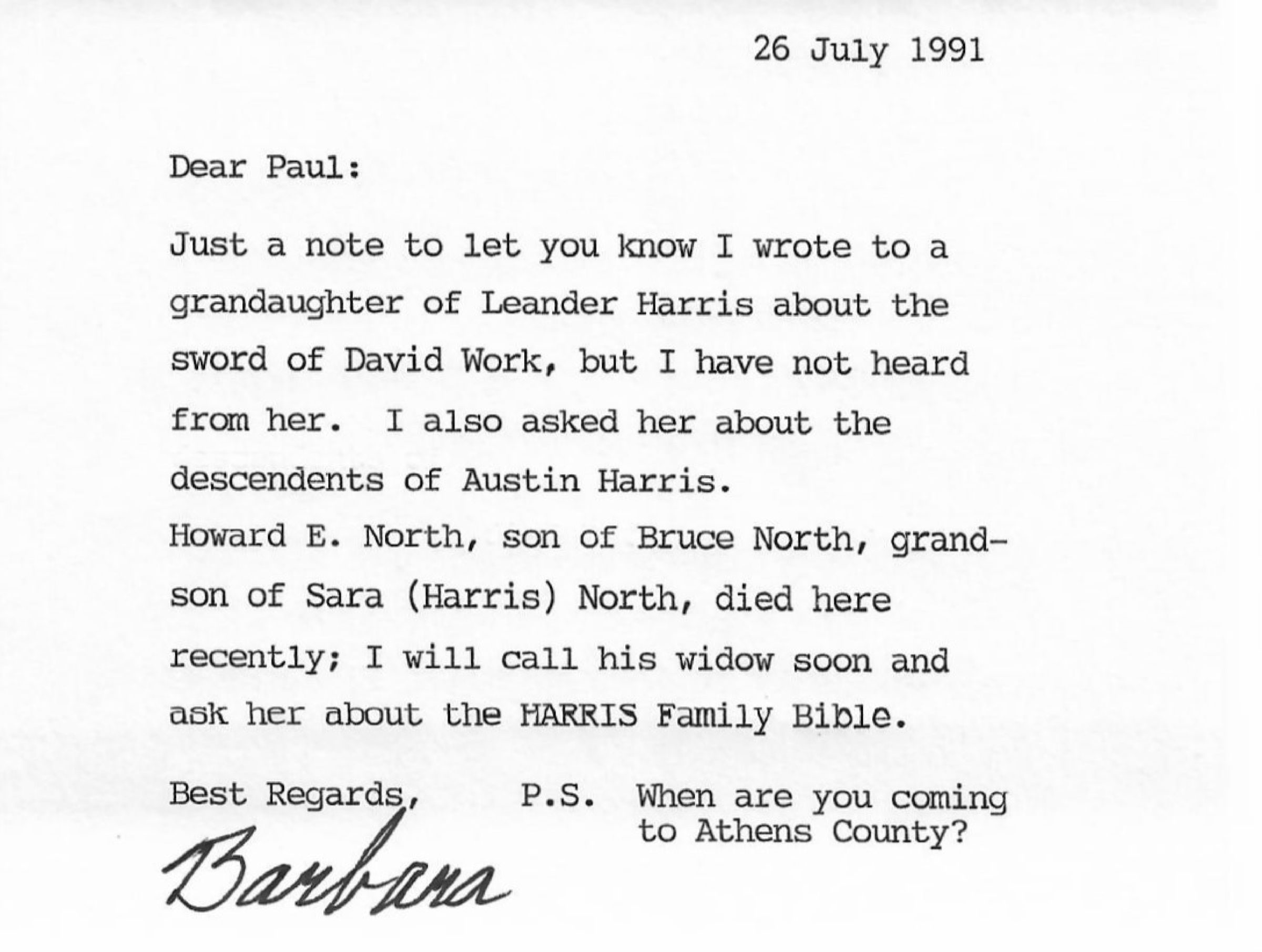 AU Gooding, Barbara [Harris] - 1991-07-26 letter to Paul J. Harris, Jr.Entry/Object ID