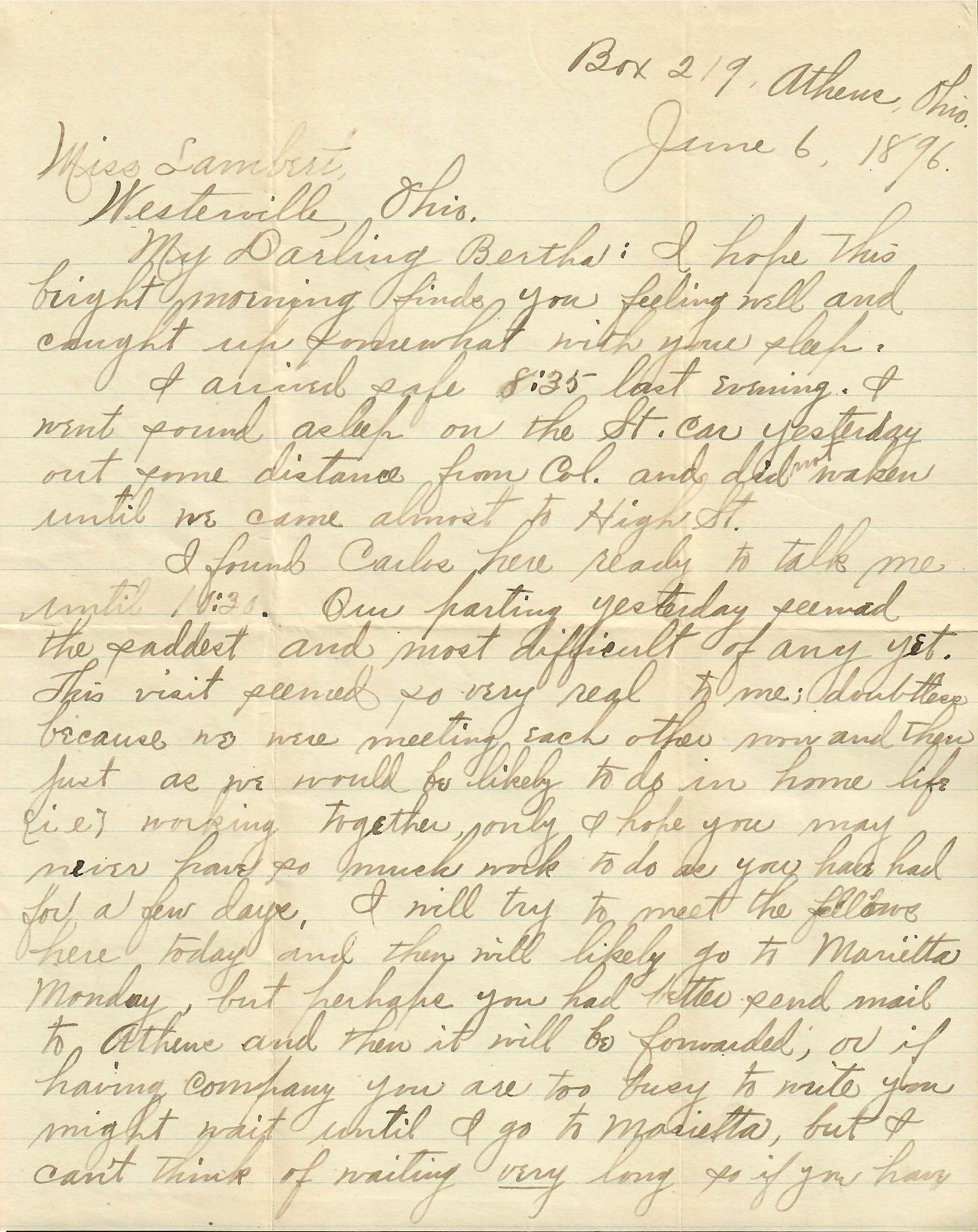 [Athens, OH, to Miss Bertha E. Lambert, Westerville, Ohio, “Franklin Co.”]