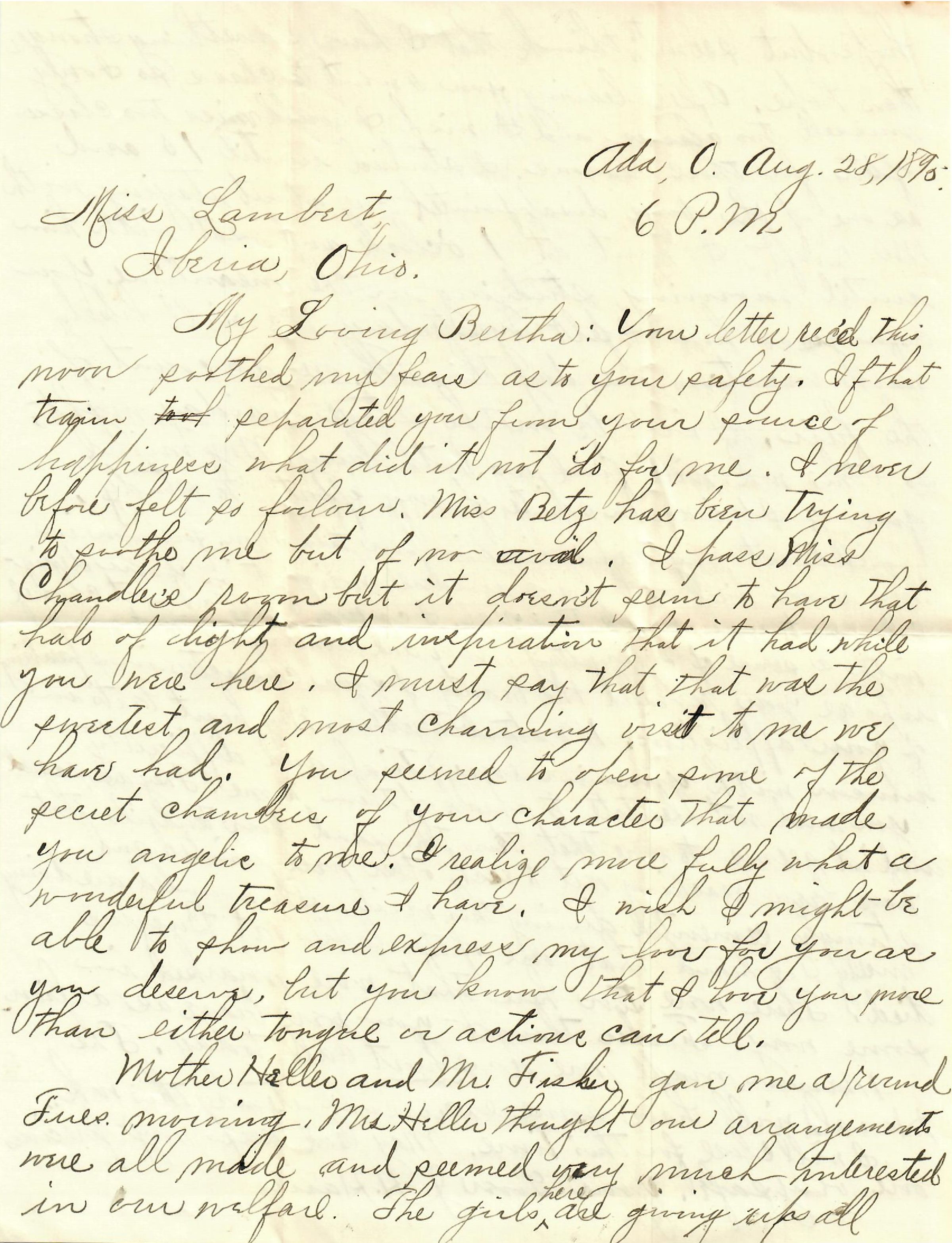 My Loving Bertha: Your letter rec'd this noon soothed my fears as to your safety. If that train separated you from your source of happiness what did it not do for me. I never before felt so forlorn. Miss Betz has been trying to soothe me but of no avail. I pass Miss Chandler's room but it doesn't seem to have that halo of light and inspiration that it had while you were here. I must say that that was the sweetest and most charming visit to me we have had. You seemed to open some of the secret chambers of your character that made you angelic to me. I realize more fully what a wonderful treasure I have. I wish I might be able to show and express my love for you as you deserve, but you know that I love you more than either tongue or actions can tell.