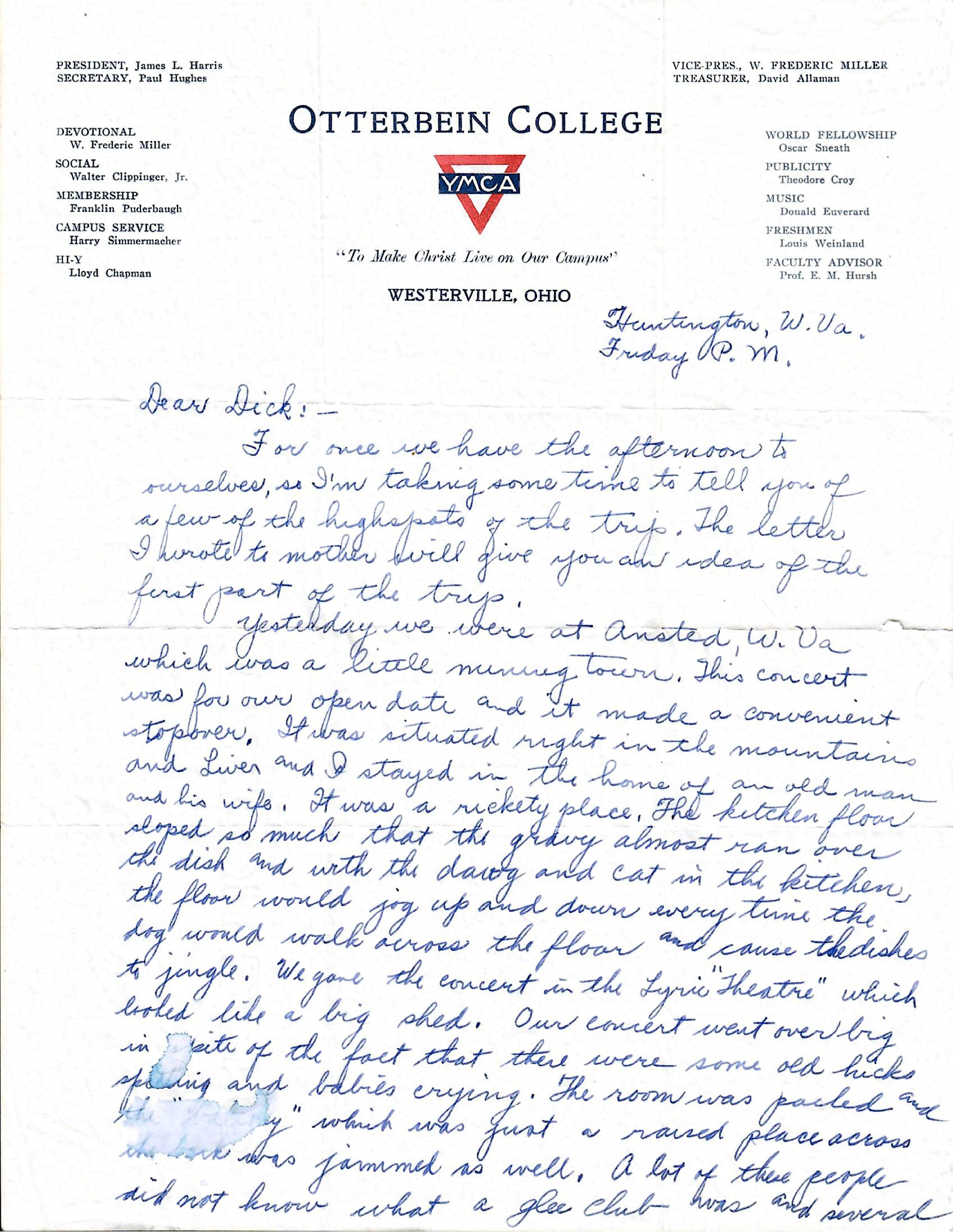 On Wedndesday we drove from Harrisonburg on sown to Staunton. However the Staunton pastor met us this side of Staunton and told us that we were to stop at the Augusta Military Academy and sing and get our dinner for it. This was quite a wonderful academy. About 350 boys from 10–18 were in this school. It is one of the best military academies for boys in Va and they have wonderful buildings. We gave a program for these boys who filed in the academy auditorium in strict order, in uniform with shoulders back and chins up. The made a wonderful appearance. I wish you could have heard them cheer and cheer for Otterbein as we started to sing! The Major gave orders that we were to have anything we wanted, he was so pleased with our program. They fed us a huge dinner in their dining and my how systematic they are. We saw them drilling for some time on the parade grounds and with the drums beating it was an impressive sight! After a swim in their new indoor pool we left for Staunton 5 miles below. Liver and I were assigned to an old Va homestead farm. The people were very simple Southern farmers. The wife was a great big tall strapping lady and very strong. She would carry big armloads of firewood for the stove and help her husband with the chores. She reminded me a lot of that servant woman Watson Harris tells about with the tail of hair hanging down her back. They treated us wonderfully and they had a very beautiful daughter about 17 or 18 and LeVere and I almost had to take turns in talking to her. At Harrisonburg, there were two twin girls and so you see we've had pretty good luck.