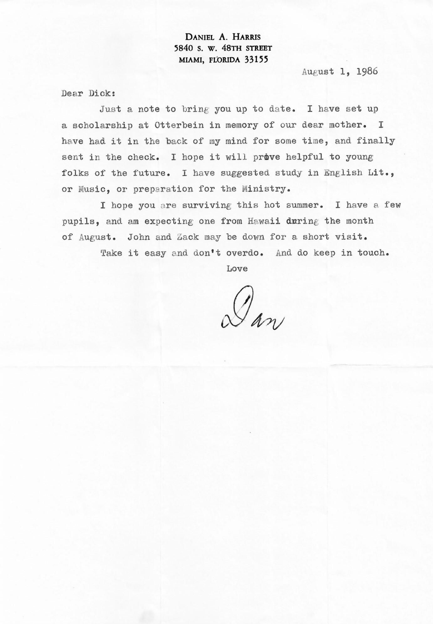 Just a note to bring you up to date. I have set up a scholarship at Otterbein in memory of our dear mother. I have had it in the back of my mind for some time, and finally sent in the check. I hope it will prove helpful to you folks of the future. I have suggested study in English Lit., or Music, or preparation for the Ministry.