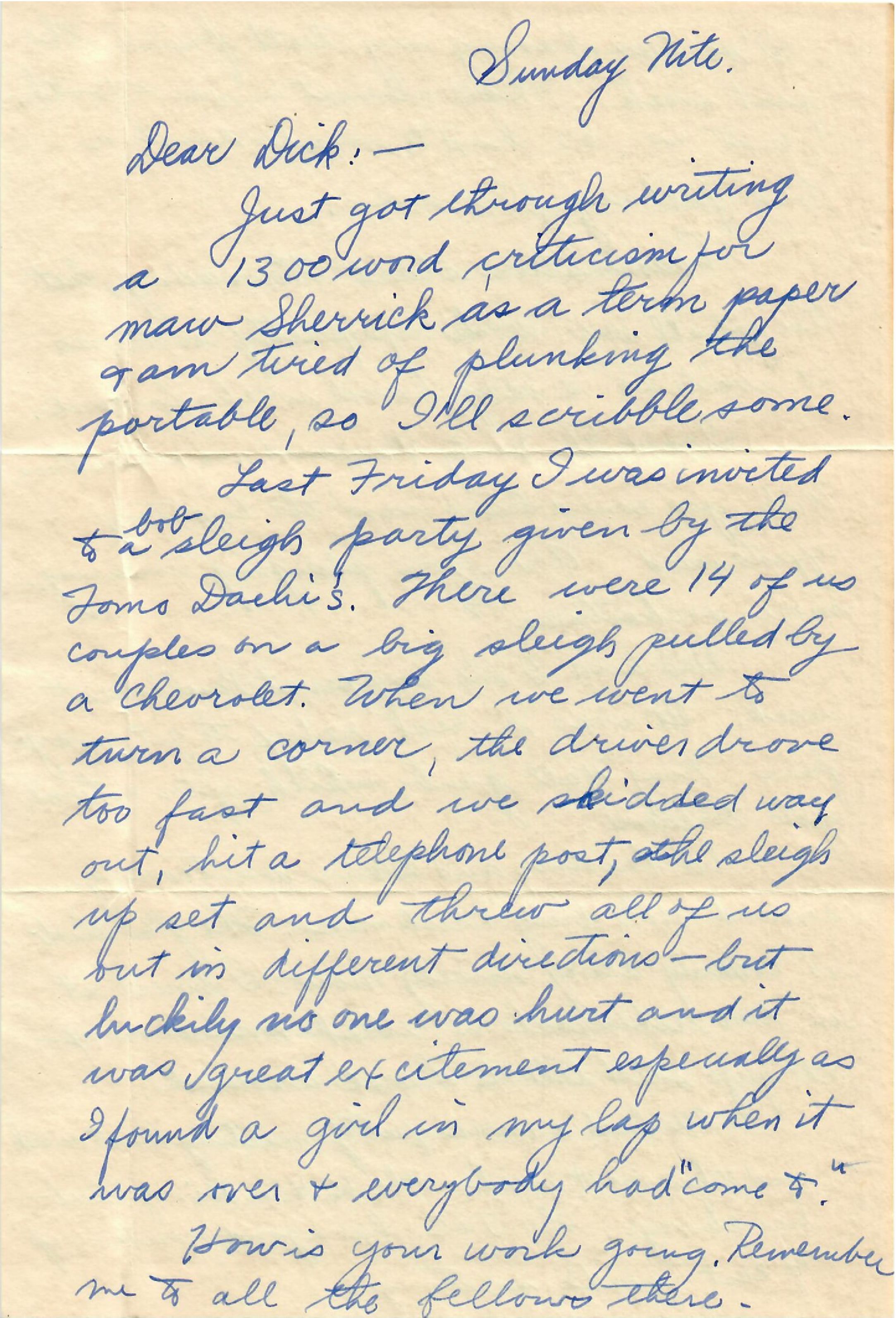 Last Friday I was invited to a bob sleigh party given by the Toms Dachi's. There were 14 of us couples on a big sleigh pulled by a Chevrolet. When we went to turn a corner, the driver drove too fast and we skidded way out in different directions—but luckily no one was hurt and it was great excitement especially as I found a girl in my lap when it was over & everybody had "come to."