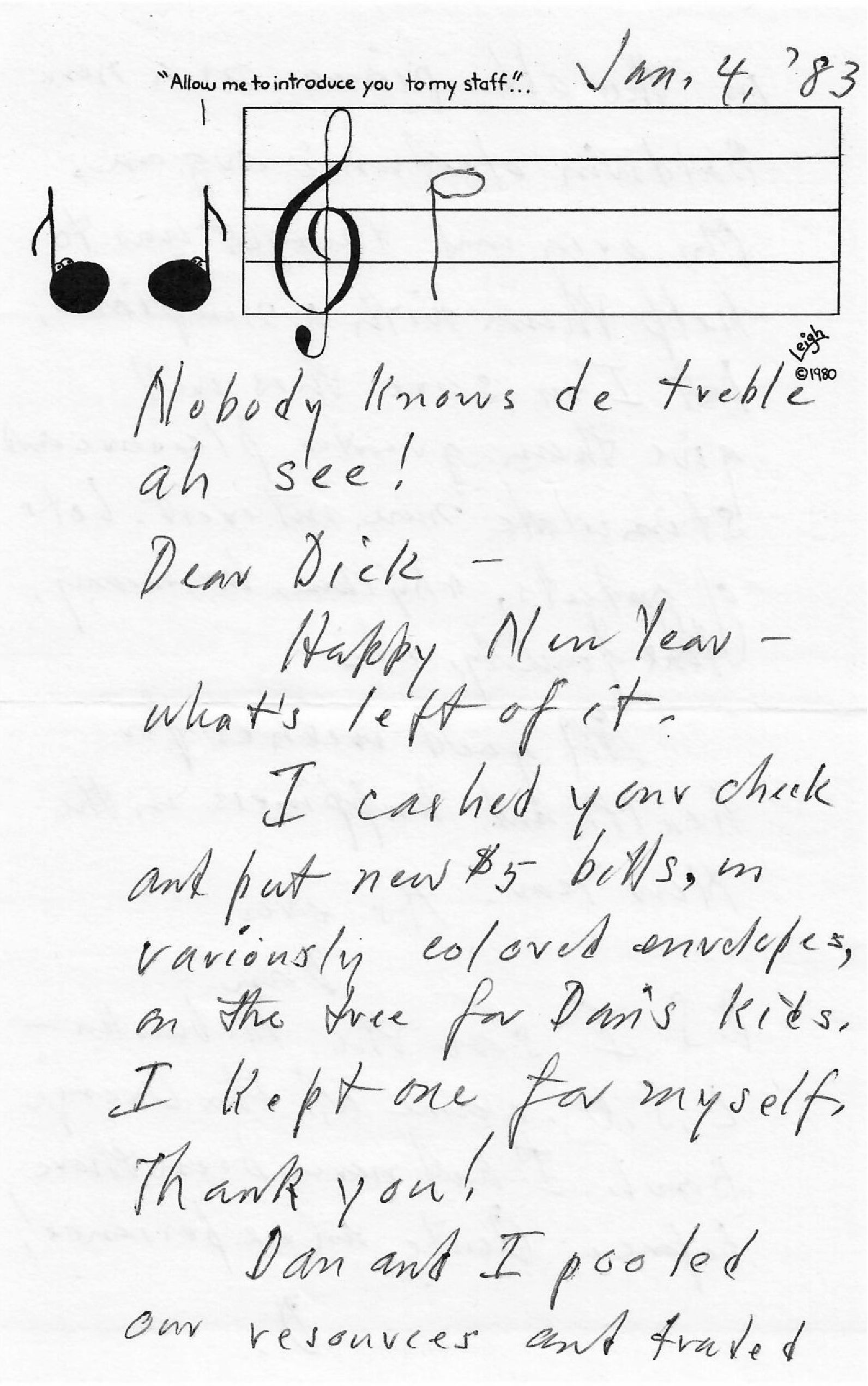I cashed your check and put new $5 bills in variously colored envelopes, on the tree for Dan's kids. I kept one for myself. Thank you!