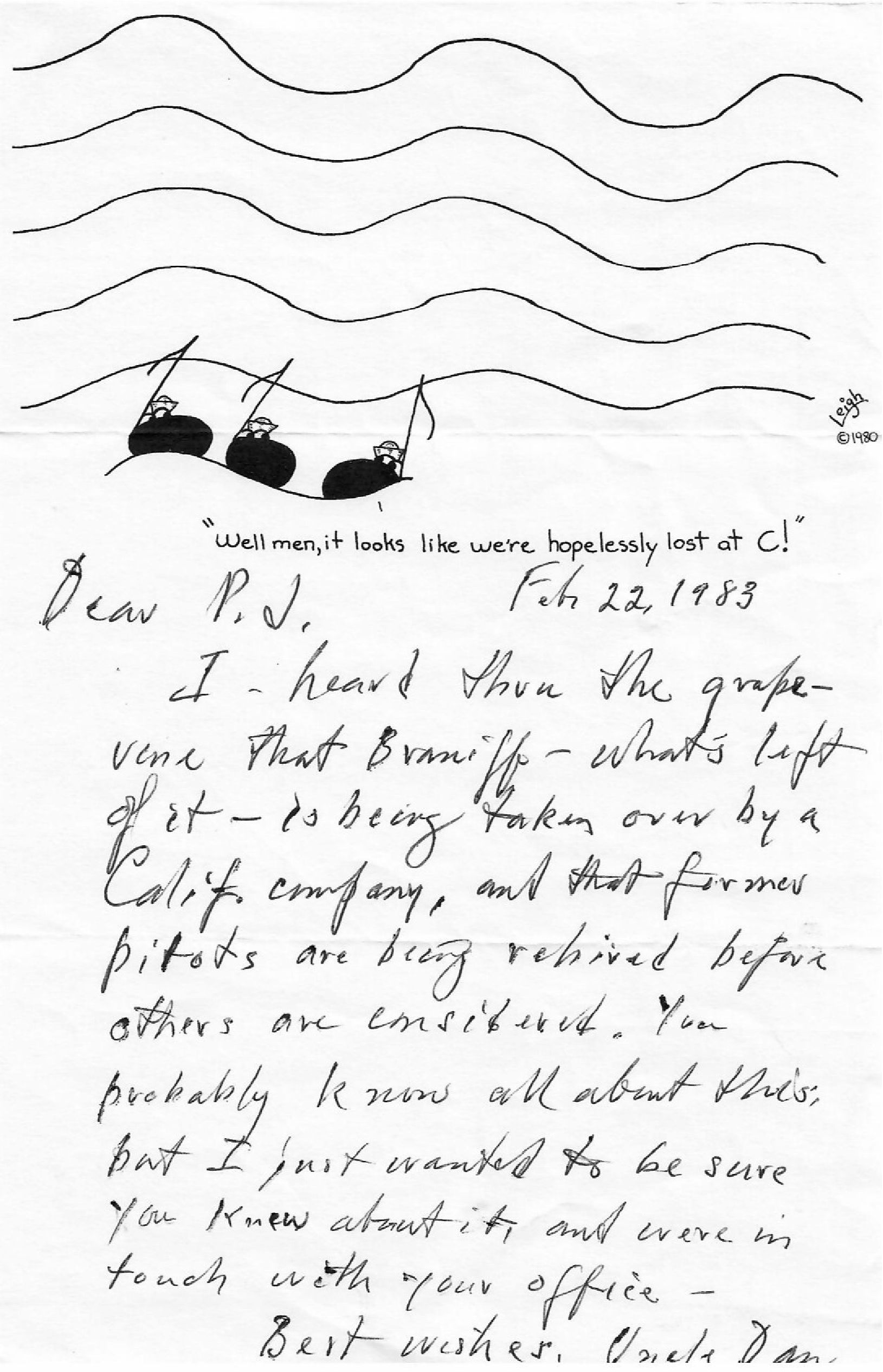 I heard through the grapevine that Braniff - what's left of it - is being taken over by a Calif. company, and that former pilots are being rehired before others are considered. You probably know all about this, but I just wanted to be sure you knew about it, and were in touch with your office -