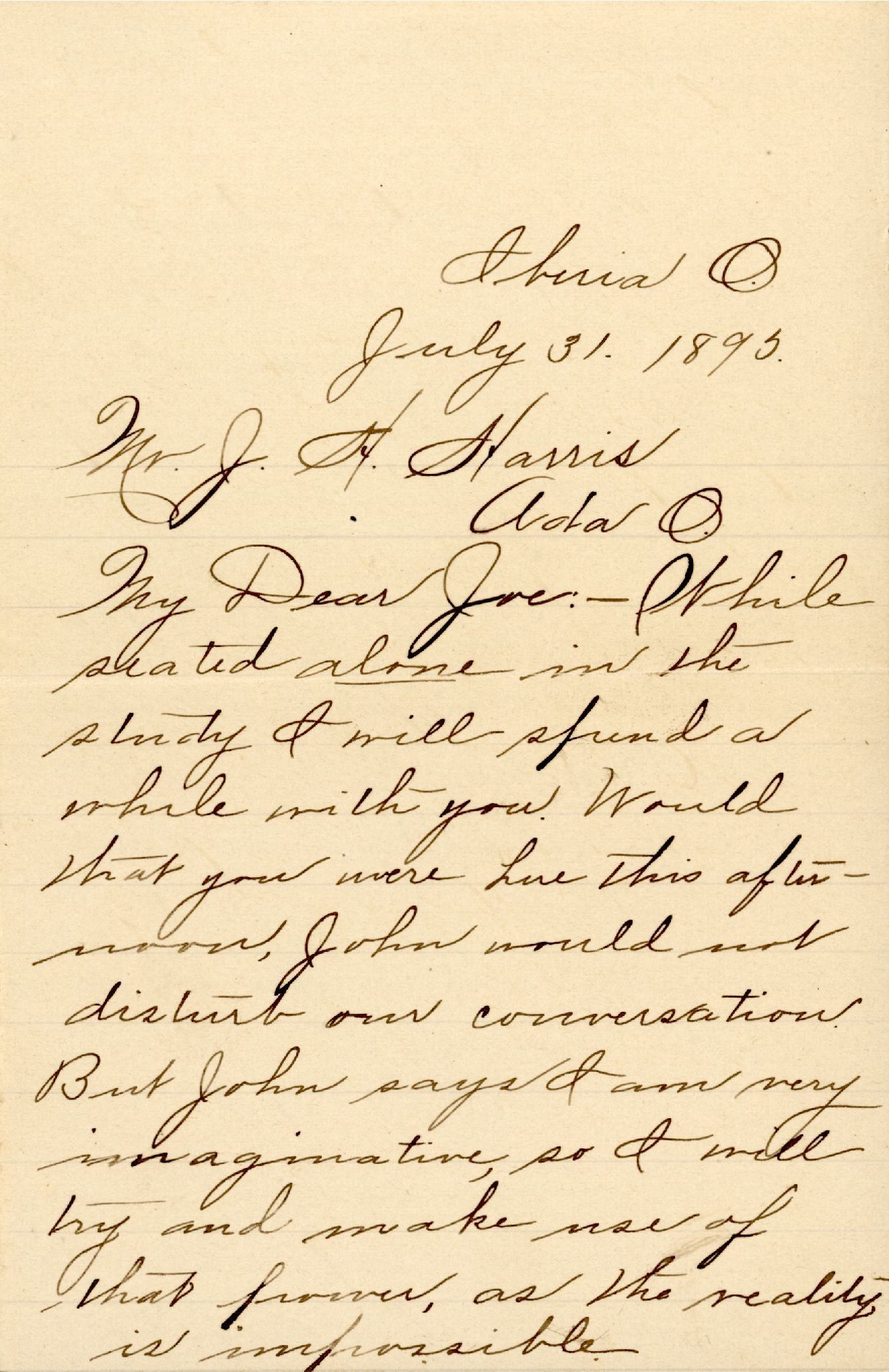 My Dear Joe: — While seated alone in the study I will spend a while with you. Would that you were here this afternoon, John would not disturb our conversation. But John says I am very imaginative, so I will try and make use of that power, as the reality is impossible.