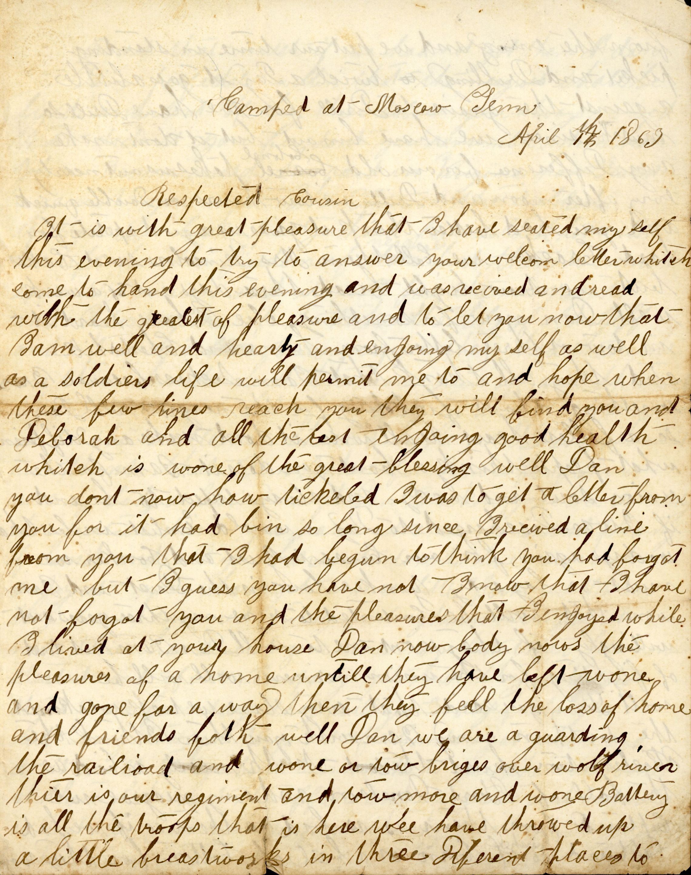 It is with great pleasure that I have seated my self this evening to try to answer your welcome letter whitch come to hand this evening and was recived and read with the greatest of pleasure and to let you now that I am well and hearty and enjoying my self as well as a soldiers life will permit me to and hope when these few lines reach you they will find you and Deborah and all the rest enjoying good health which is wone of the great blessing well Dan you dont now how tickeled I was to get a letter from you for it had bin so long since I recived a line from you that I begun to think you had forgot me but I guess you have not I now that I have not forgot you and the pleasures that I enjoyed while I lived at your house Dan now body nows the pleasures of a home untill they have left wone and gone far a way then they feel the loss of home and friends both well Dan we are a guarding the railroad and wone or tow briges over wolf river thier is our regiment and tow more and wone Battery is all the troops that is here wee have throwed up a little breastworks in three Diferent places to ... from the enemy and we put our time in standing picket and Drilling twice a Day it goes alittle against the grain to Drill for we have Drill so much since we have bin out but it dont make any Difference for our old Colonel takes us out nearly every after noon and Drills us tow hours on Double quick and you had better think it gives us a good apetite for hard Cracker we call them Mrs Lincolns sweat Cakes but we draw light bread three days out of a week well Dan now for something else I have heard it in tow or three letter from home and Chesterhill and they all think that I am sechess because I wrote something about fighting for the neagroes well Dan so a fellers heart is all wrte it dont make any difference what people think a bout you does it I am for the union soul and body and always expect to be and if I was Discharged to Day i would Enlist in less than two days again for our Cause is just and Conker we must or lay every Yankee low in the Dust and I am wone that will be contented to serve my three years out willingly if they wont me to well Dan I am not tired of fighting for the union nor never will be well Dan you said that every slave we took weakened the southern army I am with you thier I think the Proclamation hurt the South as bad as the ball of Fort Donelson and every neagroe we Captured from them is as bad on them as if we had Captured a bushel of corn or a bail of Cotton for they would Raised that much if we had not got them dan I am perfectely willen that the neagroes shall be freed and sent of by thier selves you always nowed that dident you for dont you remember when John Brown maed hes reid in Virginia how I went against you and Ike Porter on the subject it does look purty hard for a soldier to risk his life for the freedom of neagroes but then we must save the union and it will free the neagroes to and I dont care if it takes the life of old Jeff and all of his Crew wonece they had the rains in thier hands but the horse run off and throwed the rider into a fit of Confedracy and old Abe got in to the sadle an checked him well Dan you must not think that I am sechess for I am as far from it as any body a living well Dan I reckon your are somebody for seartain since you have got a new house and pleanty of land and all you have to do is to live now and enjoy it you have got a nice little farm well Dan they have comenced giving furloughs in our regiment now thier has several gone home now but thier has none started out of our Company yet but they will tow start in a few days they will get 30 days furloughs but only tow gets to go out of a Company at a time and it will take about 20 months to give them all wone al them lieks but the officers and seargeants and Corporals will get the first wones so I dont think I will get wone before my time is out but If I live that long I think I will except of wone then well Dan I am on Camp guard to night and I am sitting up and writing while all the rest is in bed Asa and Eligah are both well and Asa is in bed and begining to snore well Dan I will tell you what kind of grub we draw we get light bread half of the time and the rest hard crackers and fat pork and beans and a few potatoes [--lt] homony some molasus and a little whiskey and several things to [-egious] to menention but we get pleanty the most of the time some times we run out and then they is a kick up in the kitchen they are going to fill all of the old regiments up with Conscripts and I think it is a good idea for thier is so many peaces of regiments and so many officers a getting pay that is not doing no duty I got a letter from Jonathan Fawcett last evening he is in port Royal and well and hearty well I must bring my scribbling to a close for it is getting late and nearly time for me to go on guard so no more at preasant please excuse mistakes and bad writing for thier is pleanty of them give my love to all that enquires after me and keep a good ration for your self and family so [mo] but well wishes from your well wishing Cousin