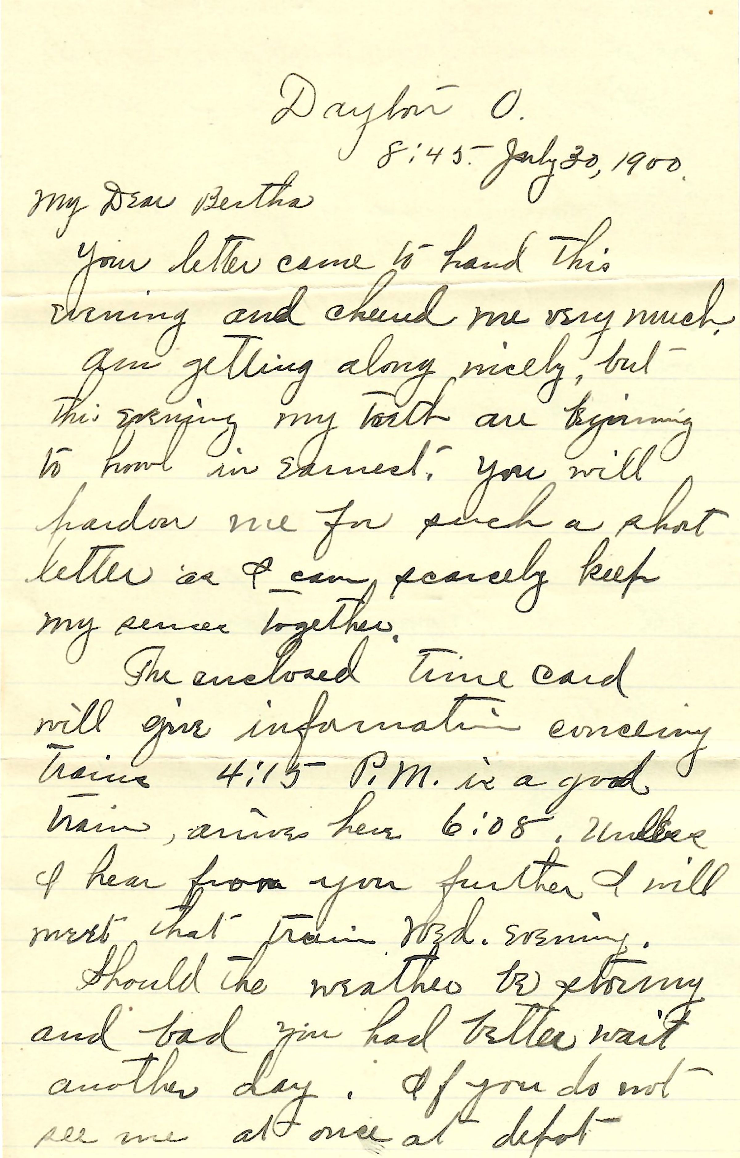 [Postmarked Dayton, Ohio to Mrs J. H. Harris, Box 344, Westerville, Ohio. Encl. Train schedule]