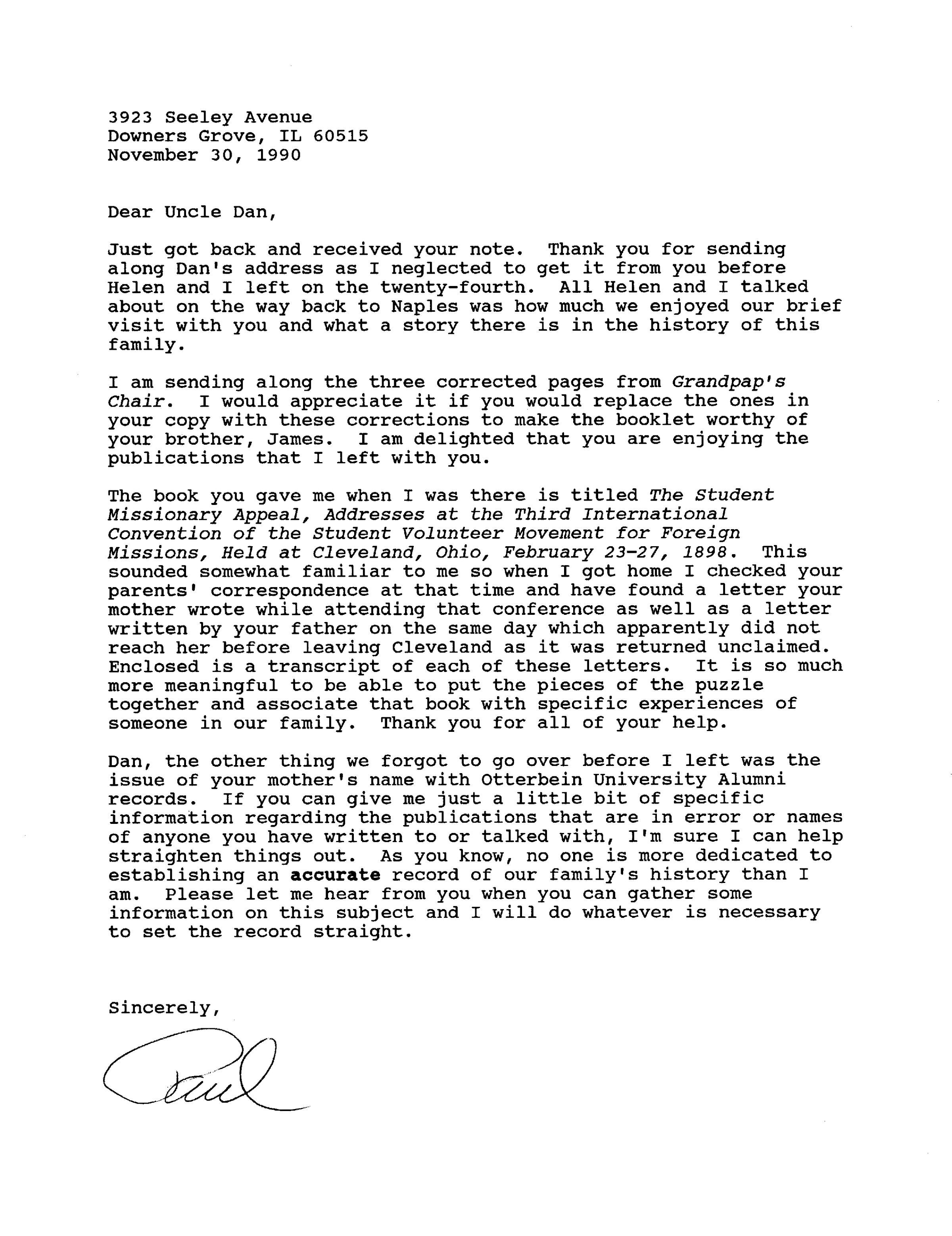 Dan, the other thing we forgot to go over before I left was the issue of your mother's name with Otterbein University Alumni records. If you can give me just a little bit of specific information regarding the publications that are in error or names of anyone you have written to or talked with, I'm sure I can help straighten things out. As you know, no one is more dedicated to establishing an accurate record of our family's history than I am. Please let me hear from you when you can gather some information on this subject and I will do whatever is necessary to set the record straight.