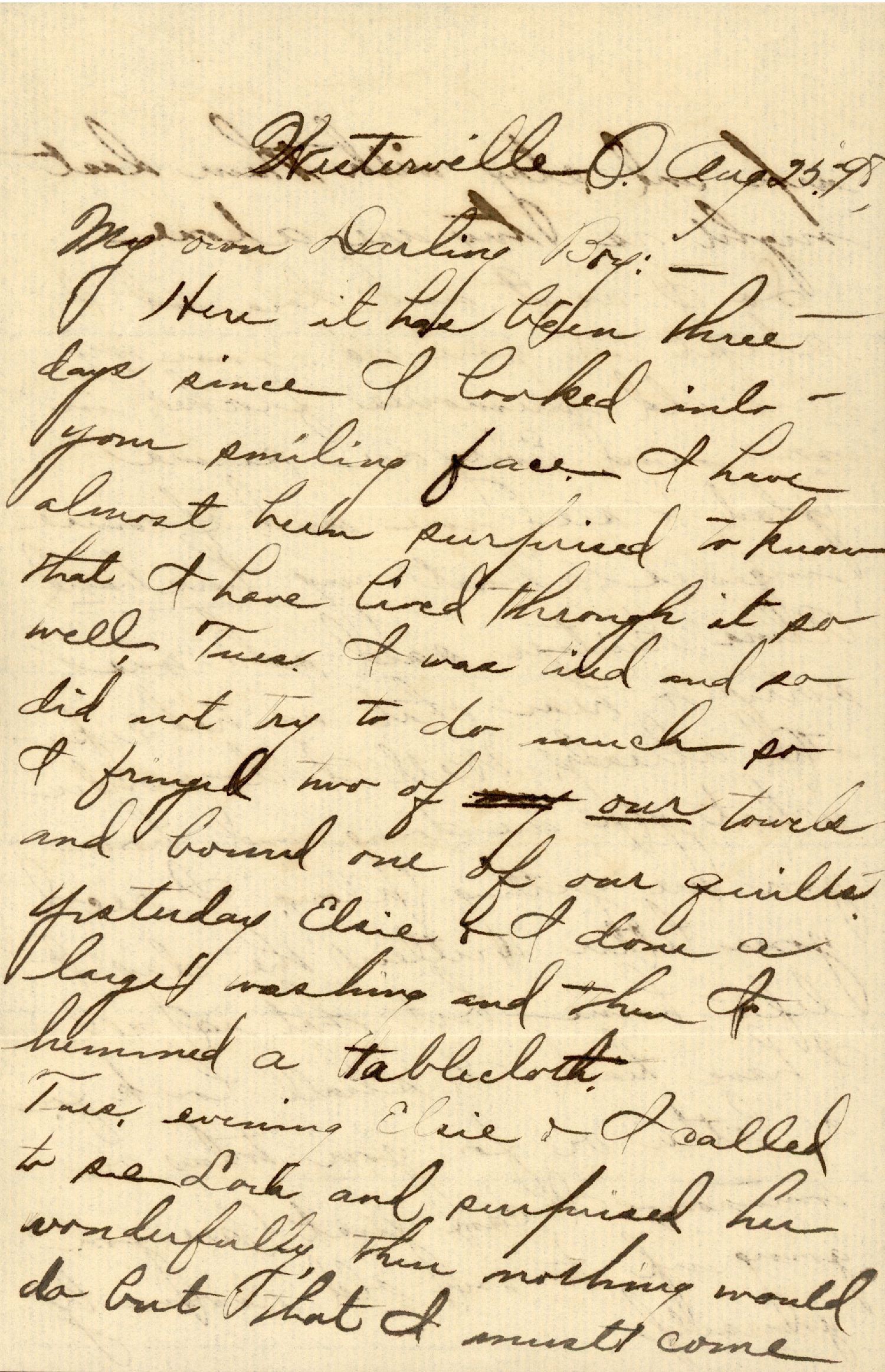 Here it has been three days since I looked into your smiling face. I have almost been surprised to know that I have lived through it so well. Tues. I was tired and so did not try to do much so I fringed two of my our towels and bound one of our quilts. Yesterday Elsie & I done a large washing and then I hemmed a tablecloth.