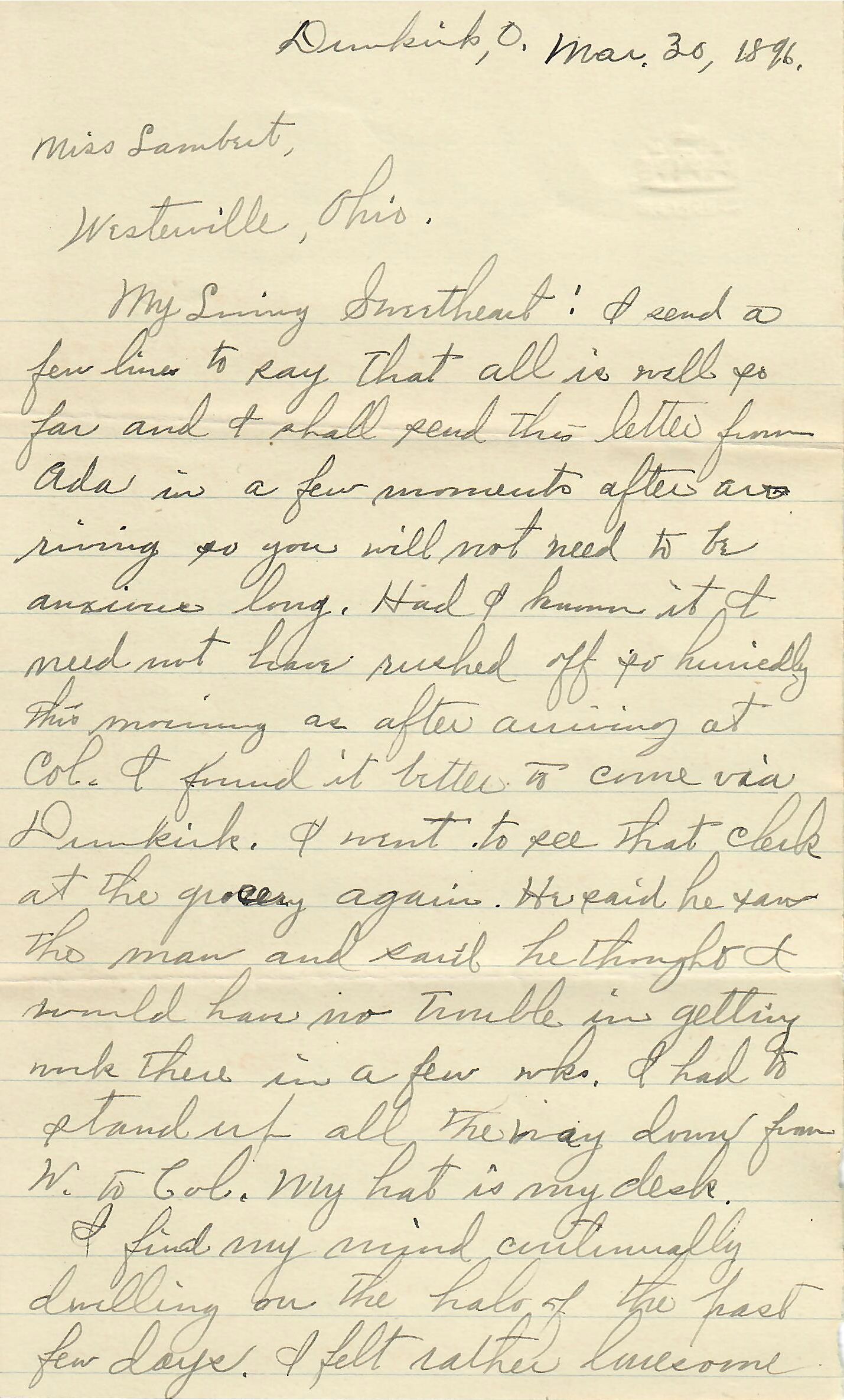 My Loving Sweetheart: I send a few lines to say that all is well so far and I shall send this letter from Ada in a few moments after arriving so you will not need to be anxious long. Had I known it I need not have rushed off so hurriedly this morning as after arriving at Col. I found it better to come via Dunkirk. I went to see that clerk at the grocery again. He said he saw the man and said he thought I would have no trouble getting work there in a few wks. I had to stand up all the way down from W. to Col. My hat is my desk.