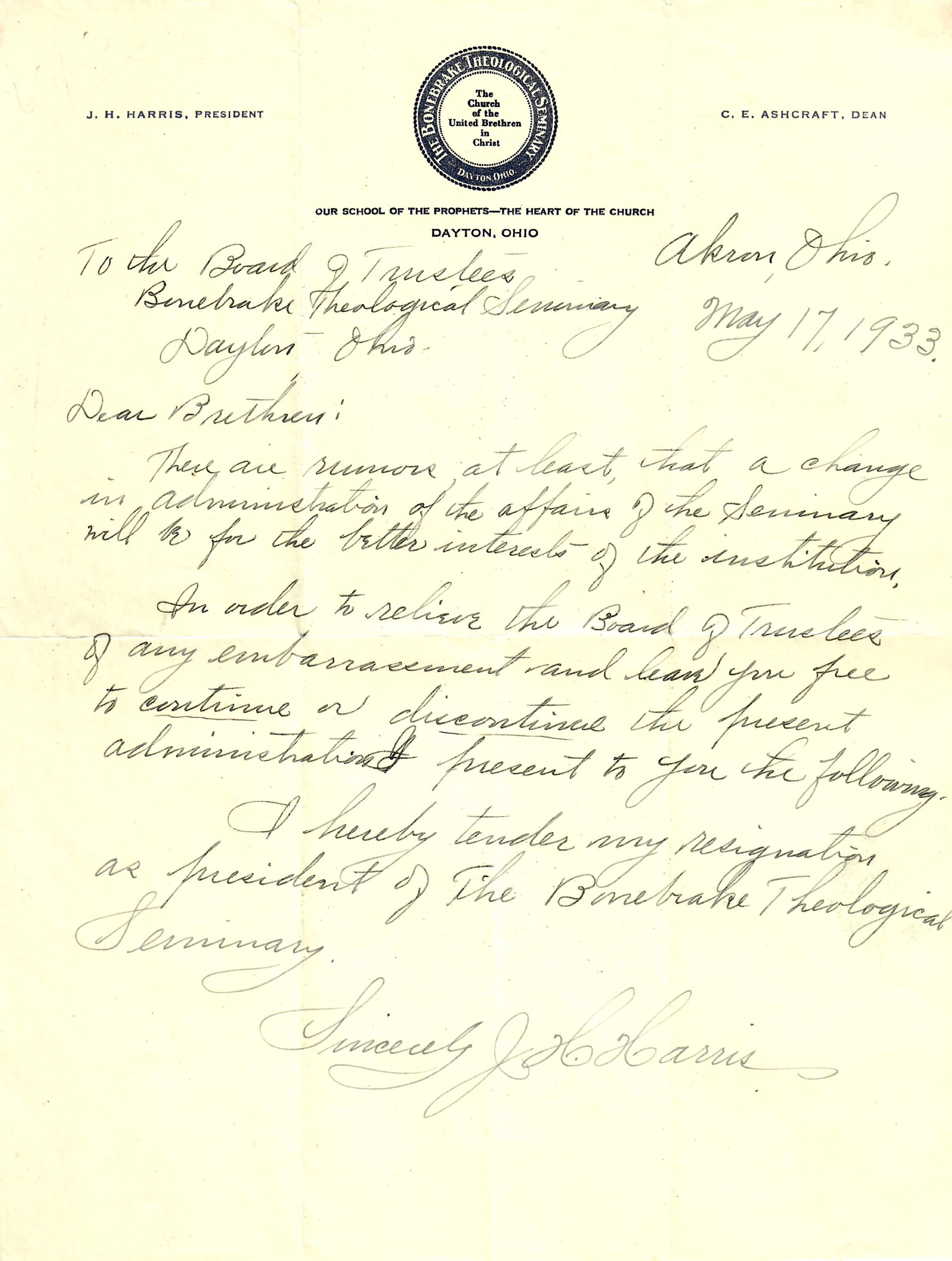 AU Harris, Joseph Hastings - 1933-05-17 letter to Board of Trustees, Bonebrake SeminaryEntry/Object ID
