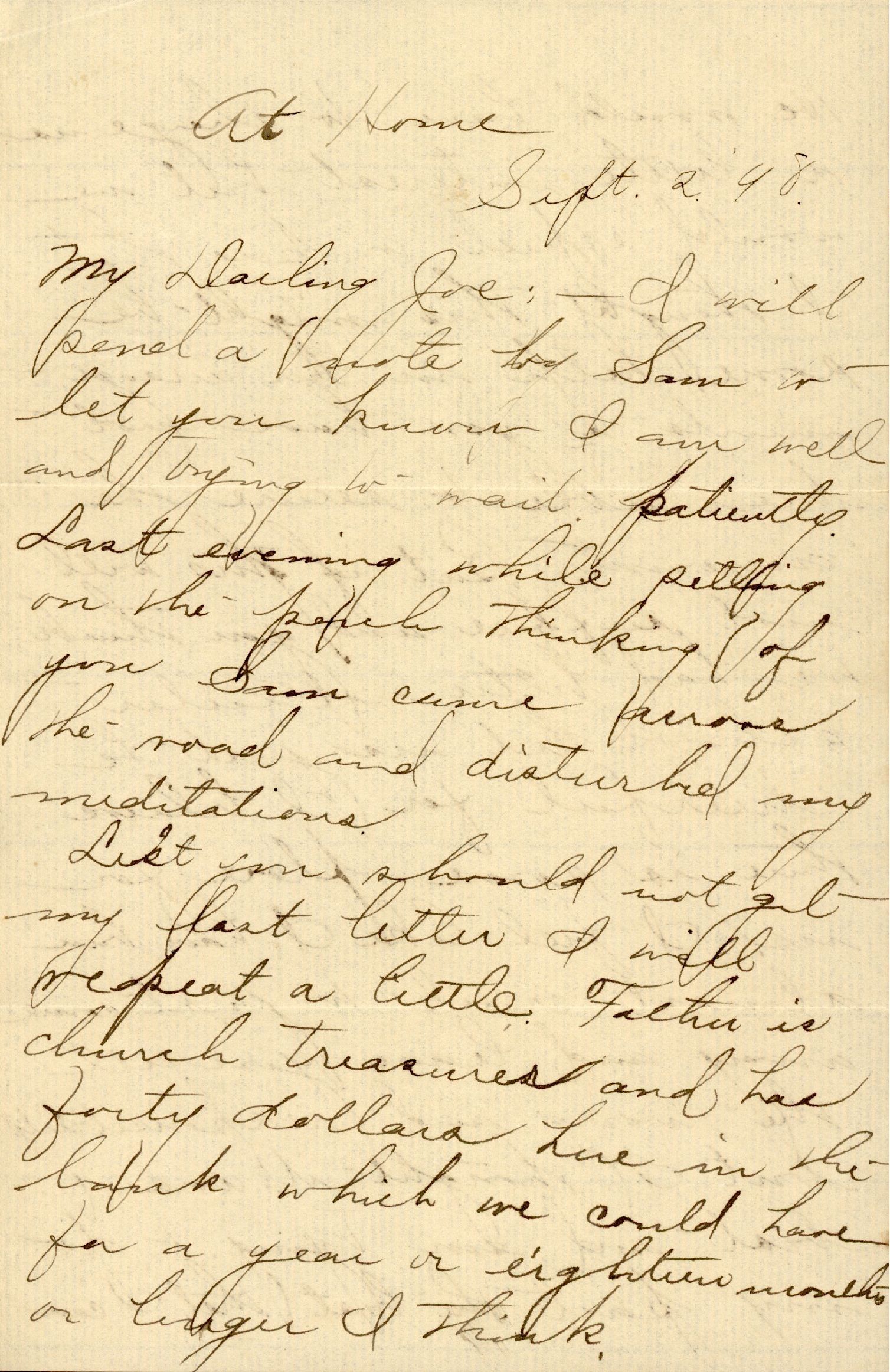 My Darling Joe; -- I will send a note by Sam to let you know I am well and trying to wait patiently. Last evening while setting on the porch thinking of you Sam came across the road and disturbed my meditations.