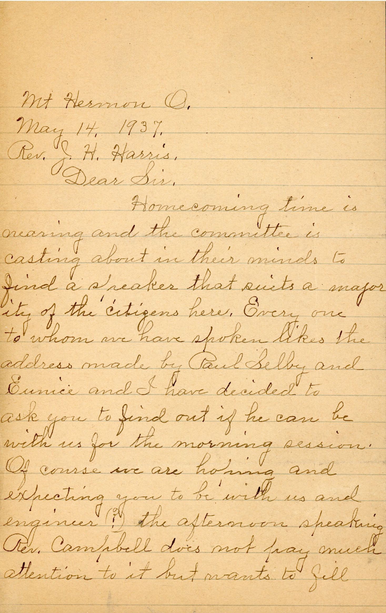 Homecoming time is nearing and the committee is casting about in their minds to find a speaker that suits a majority of the citizens here. Every one to whom we have spoken likes the address made by Paul Selby and Eunice and I have decided to ask you to find out if he can be with us for the morning session. Of course we are hoping and expecting you to be with us and engineer the afternoon speaking. Rev. Campbell does not pay much attention to it but wants to fill up the afternoon with those tiresome persons we had last year. Will you kindly let us know real soon, if you can be with us, if we can get Paul, and oh, if we could only have Ellis to sing ever so little. This meeting is a thing very near my heart and I want earnestly to make it a success. It is high time we were getting busy but we have waited for Campbell to lead.
