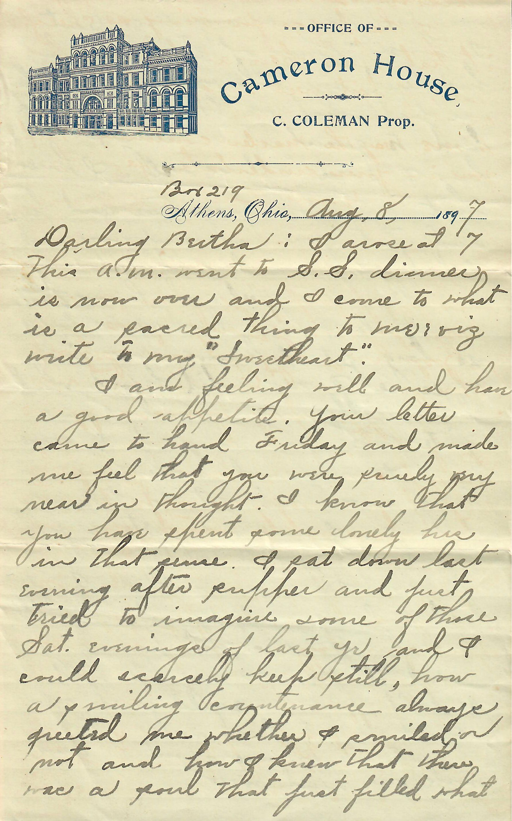 [Box 219, Athens, OH, to Miss Bertha E. Lambert, Westerville, Ohio, “Franklin Co.;” stationery from Cameron House.]