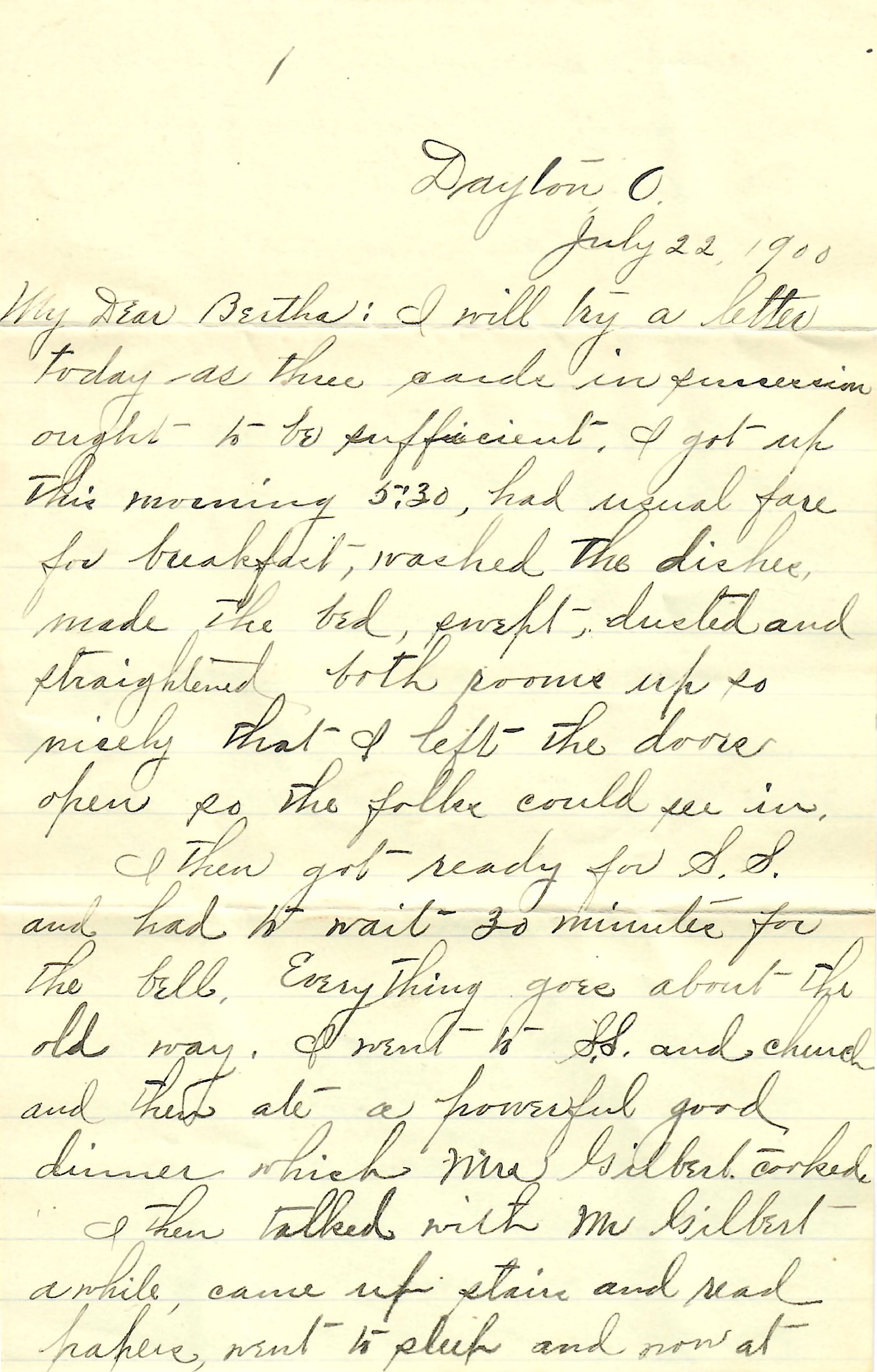 My Dear Bertha: I will try a letter today as three cards in succession ought to be sufficient. I got up this morning 5:30, had usual fare for breakfast, washed the dishes, made the bed, swept, dusted and straightened both rooms up so nicely that I left the doors open so the folks could see in.