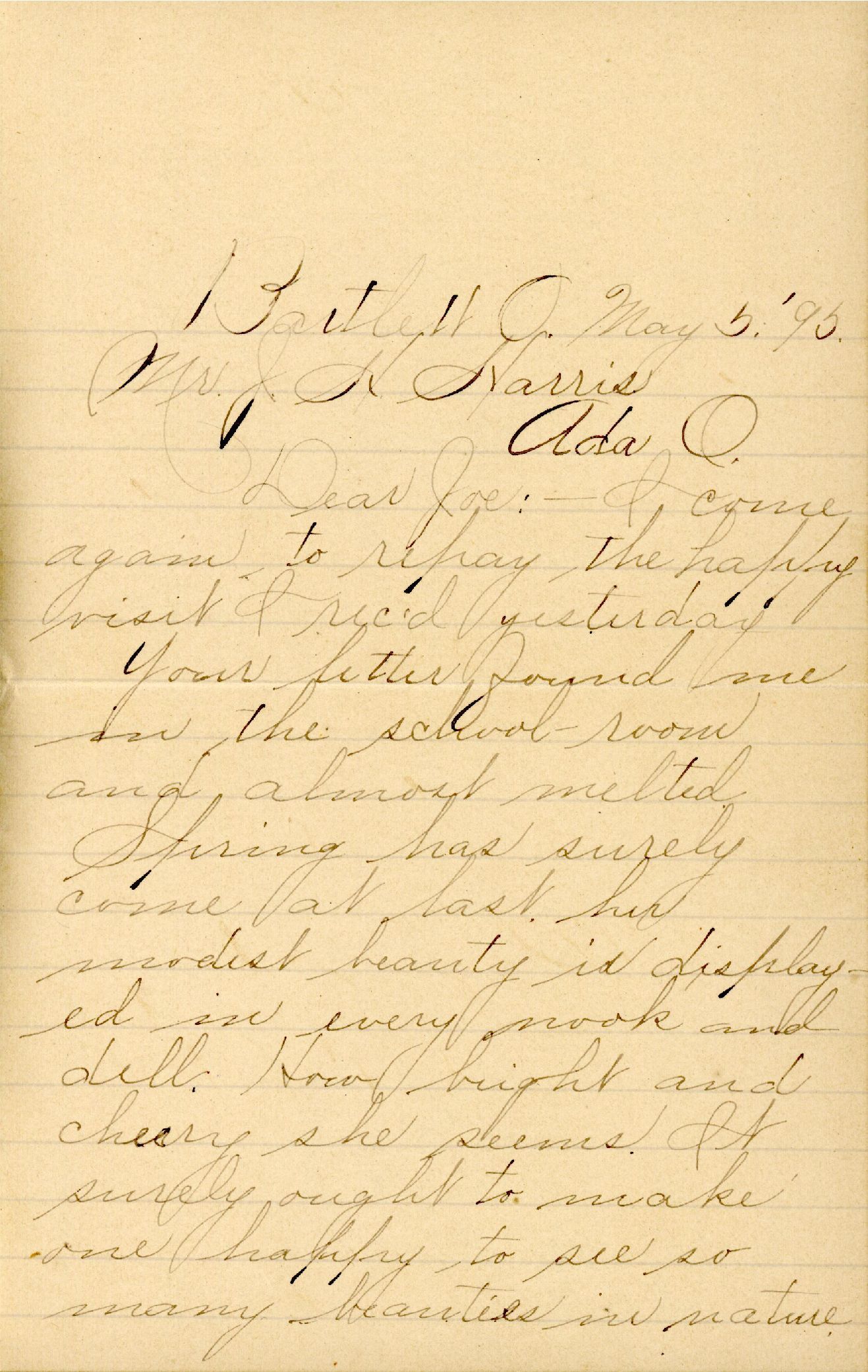 Your letter found me in the school room and almost melted. Spring has surely come at last, her modest beauty is displayed in every nook and dell. How bright and cheery she seems. It surely ought to make one happy to see so many beauties in nature.
