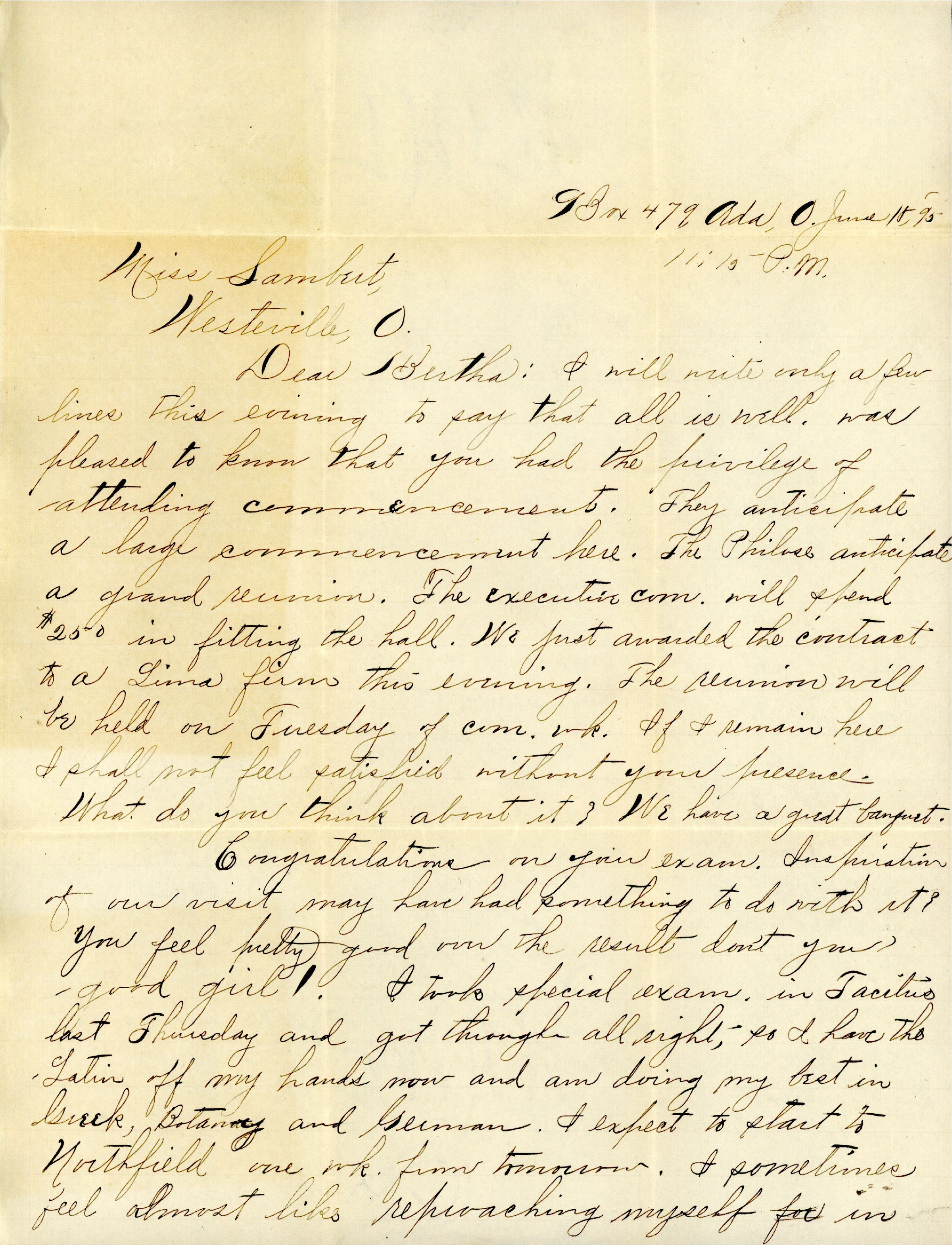Dear Bertha: I will write only a few lines this evening to say that all is well. Was pleased to know that you had the privilege of attending commencement. They anticipate a large commencement here. The Philose anticipate a grand reunion. The executive com. will spend $250 in fitting the hall. We just awarded the contract to a Lima firm this evening. The reunion will be held on Tuesday of com. wk. If I remain here I shall not feel satisfied without your presence. What do you think about it? We have a great banquet.