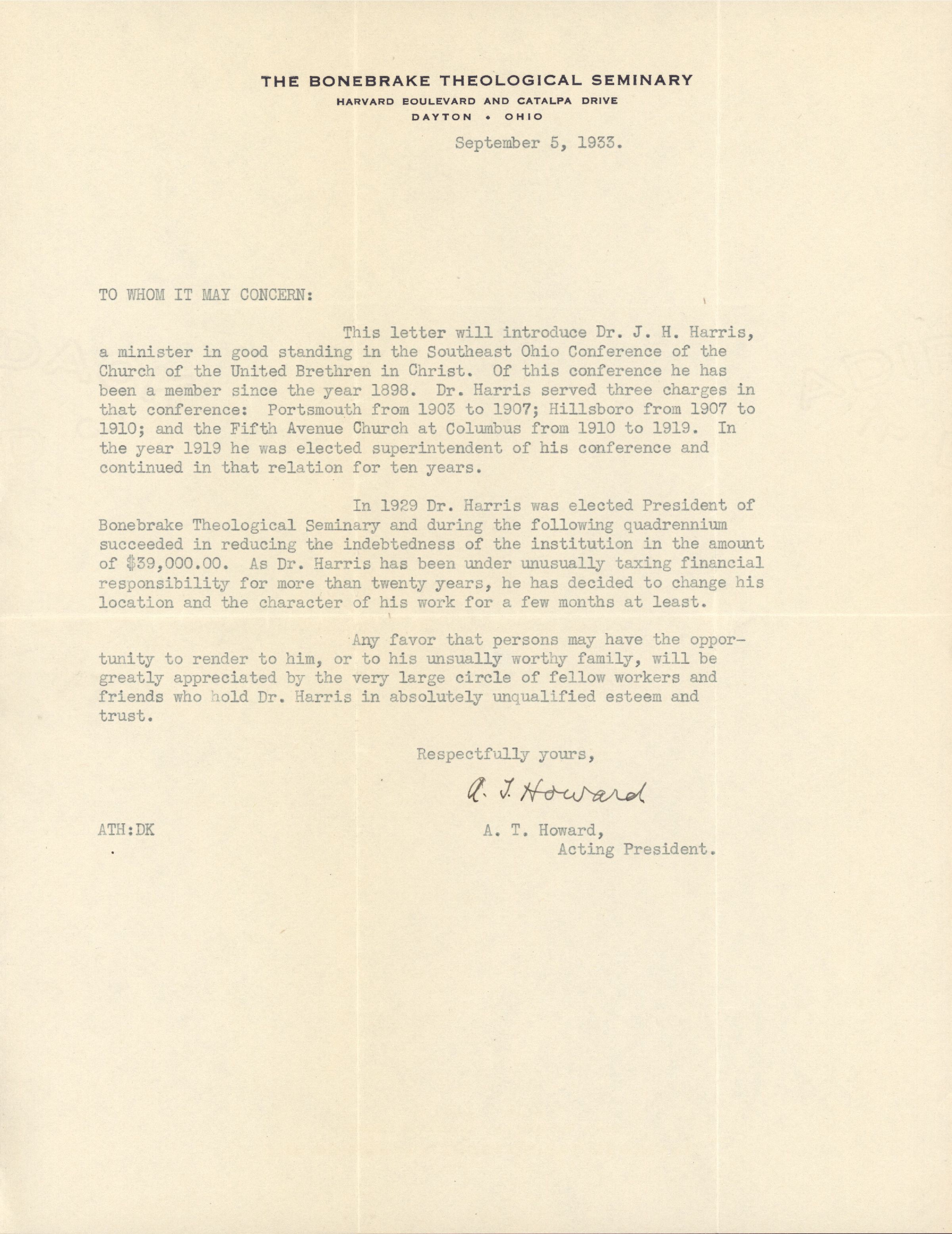 In 1929 Dr. Harris was elected President of Bonebrake Theological Seminary and during the following quadrennium succeeded in reducing the indebtedness of the institution in the amount of $39,000.00. As Dr. Harris has been under unusually taxing financial responsibility for more than twenty years, he has decided to change his location and the character of his work for a few months at least.
