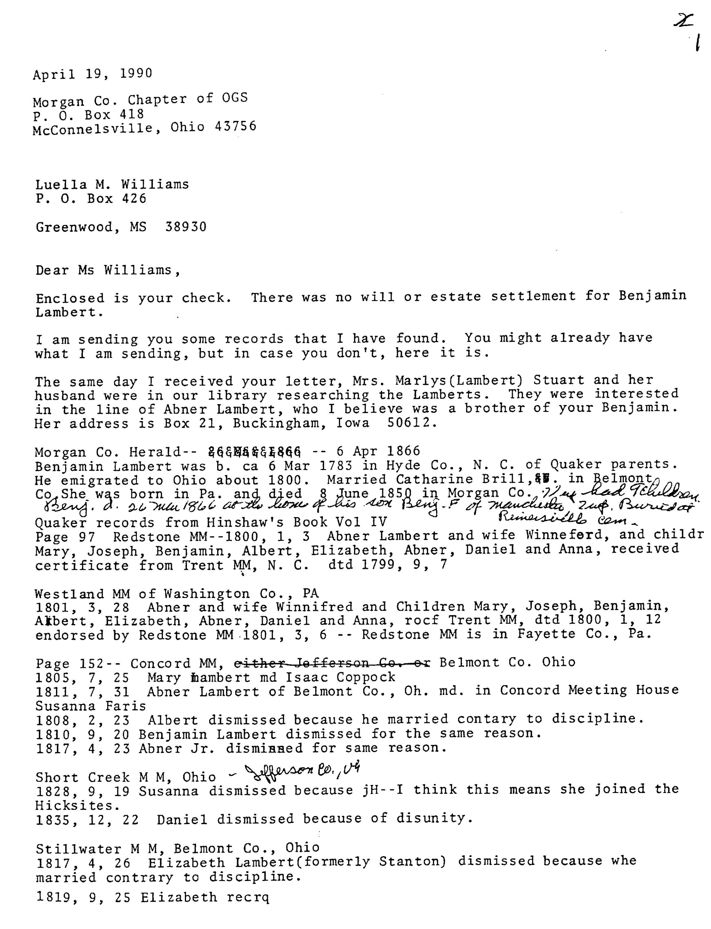 The same day I received your letter, Mrs. Marlys (Lambert) Stuart and her husband were in our library researching the Lamberts. They were interested in the line of Abner Lambert, who I believe was a brother of your Benjamin. Her address is Box 21, Buckingham, Iowa 50612.