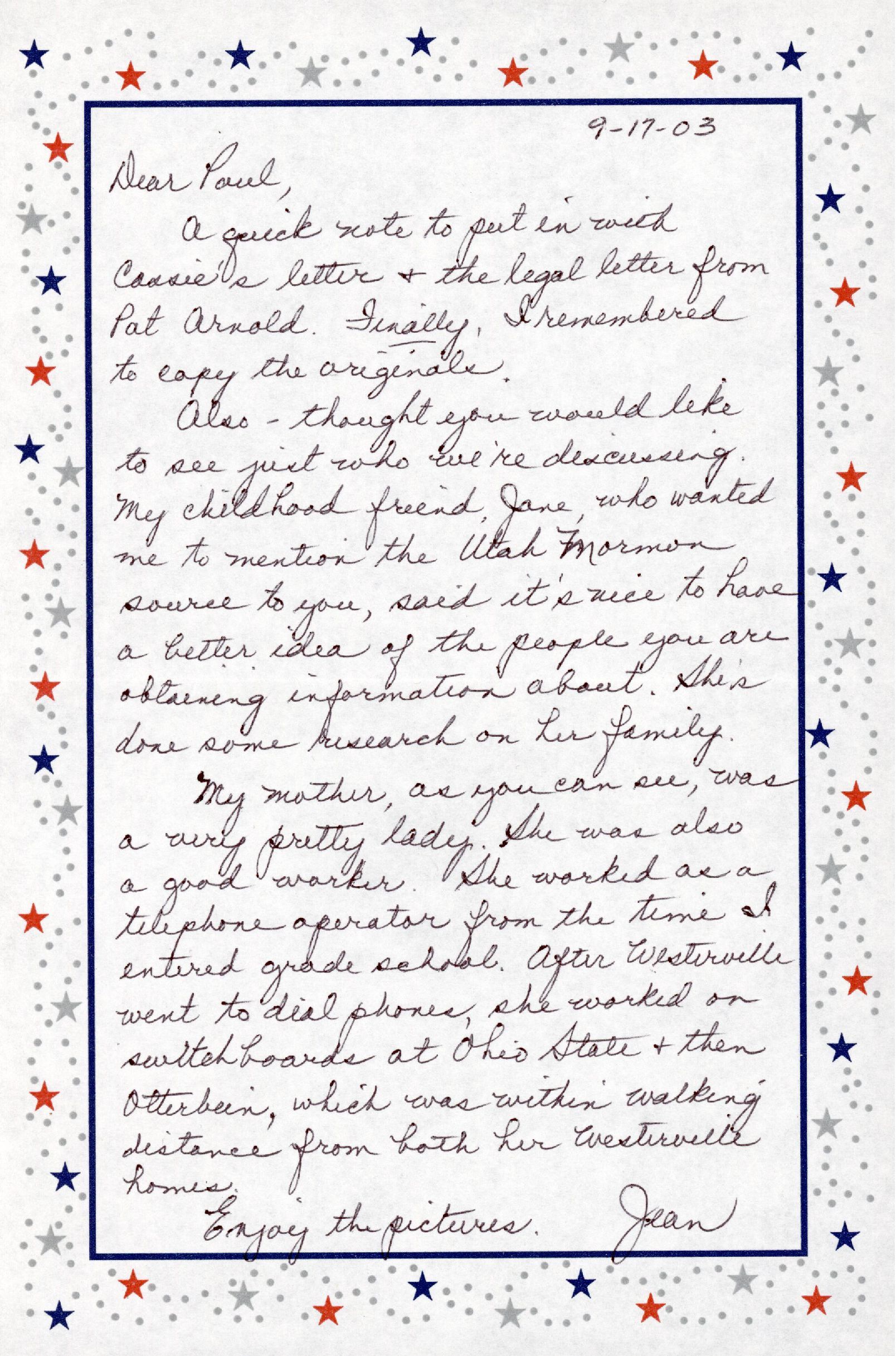 A quick note to put in with Cassie's letter & the legal letter from Par Arnold. Finally, I remembered to copy the originals.