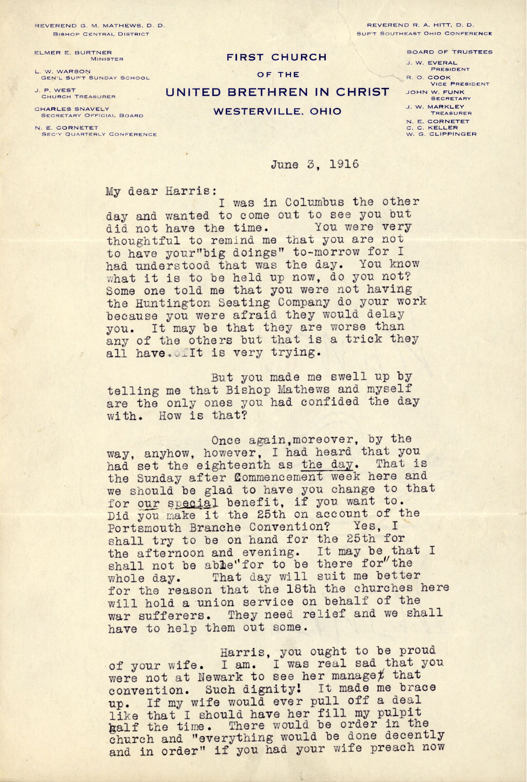 AU Burtner, Elmer E. - 1916-06-03 letter to Joseph Hastings HarrisEntry/Object ID
