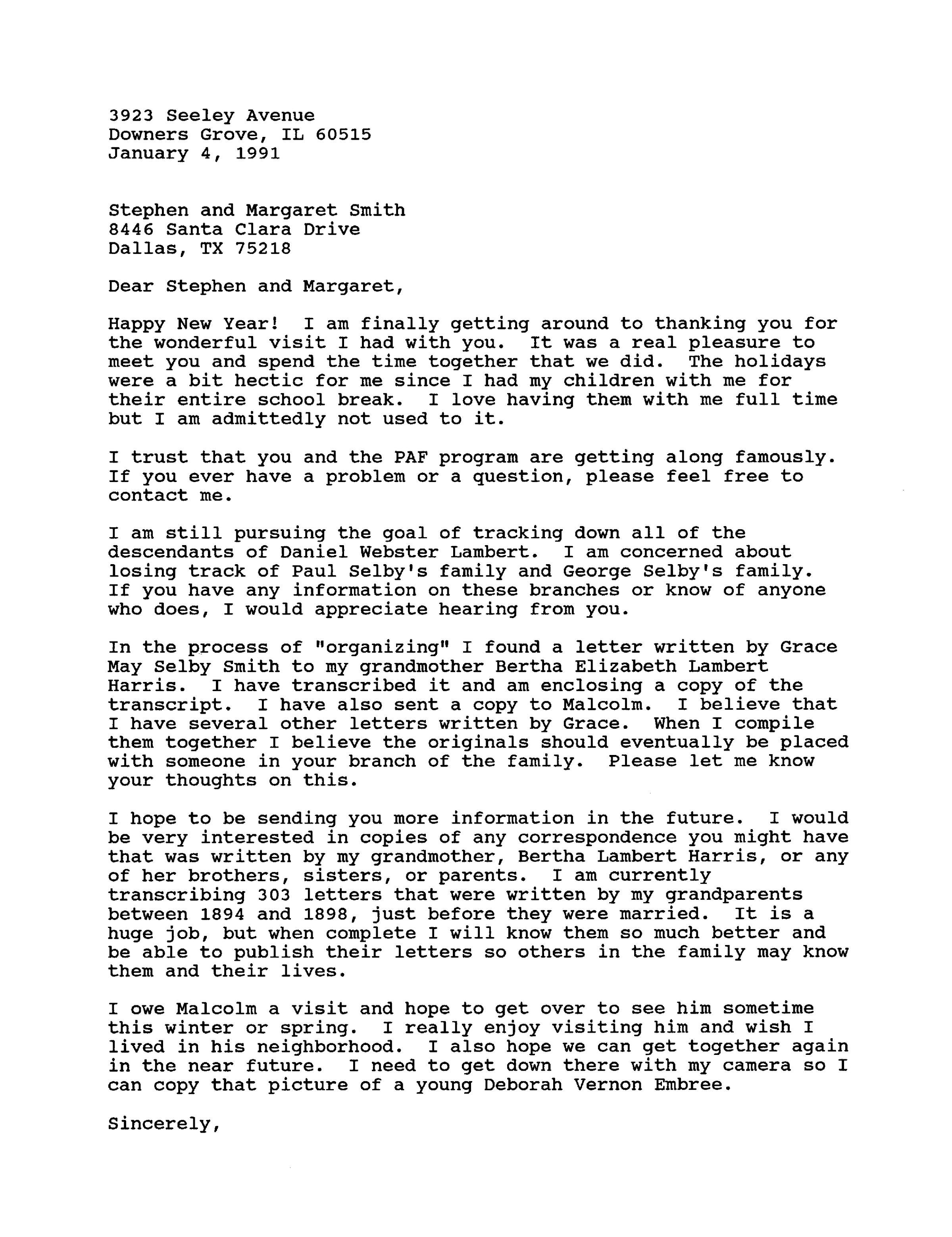 In the process of "organizing" I found a letter written by Grace May Selby Smith to my grandmother Bertha Elizabeth Lambert Harris. I have transcribed it and am enclosing a copy of the transcript. I have also sent a copy to Malcolm. I believe that I have several other letters written by Grace. When I compile them together I believe the originals should eventually be placed with someone in your branch of the family. Please let me know your thoughts on this.