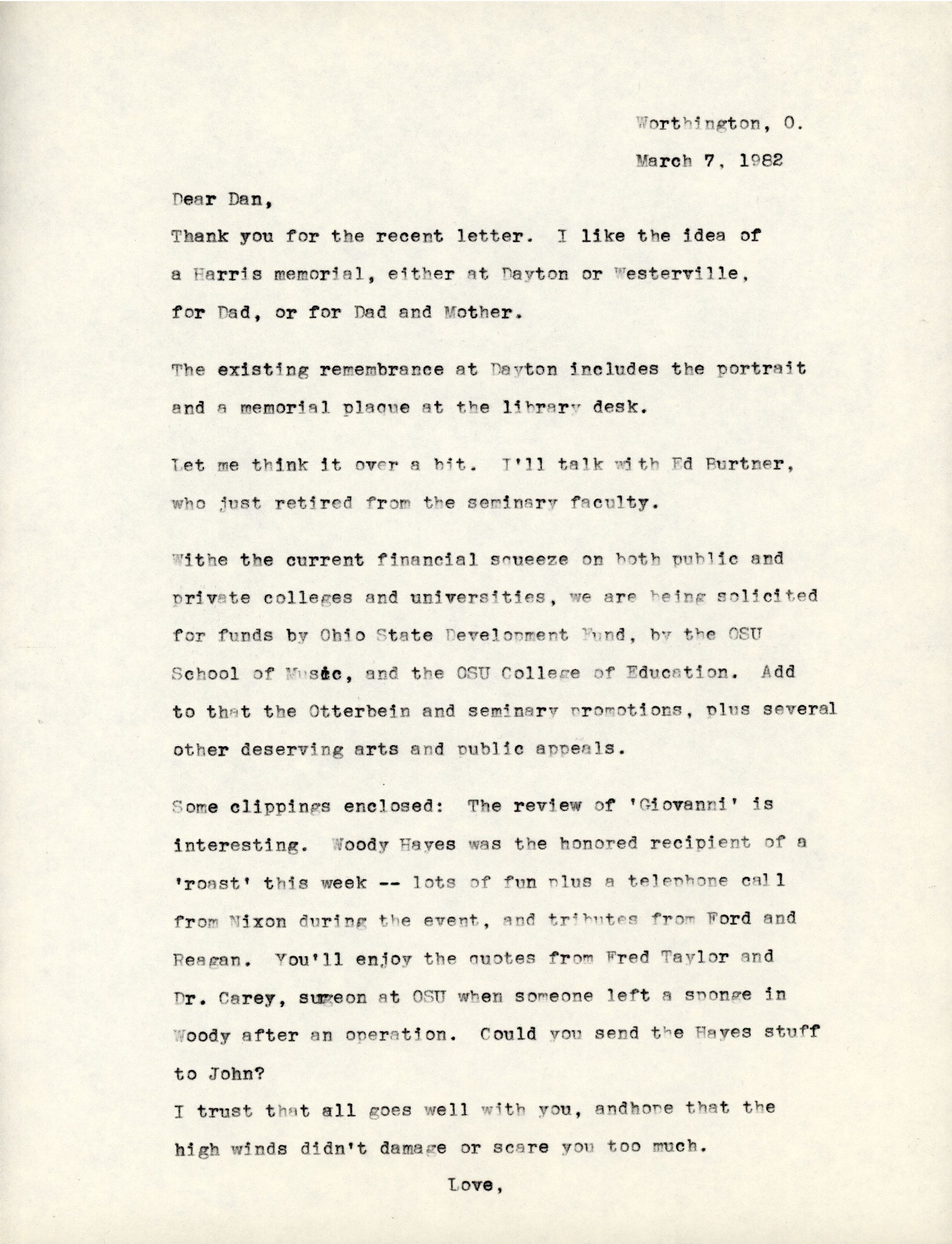 Thank you for the recent letter. I like the idea of a Harris memorial, either at Dayton or Westerville, for Dad and Mother.