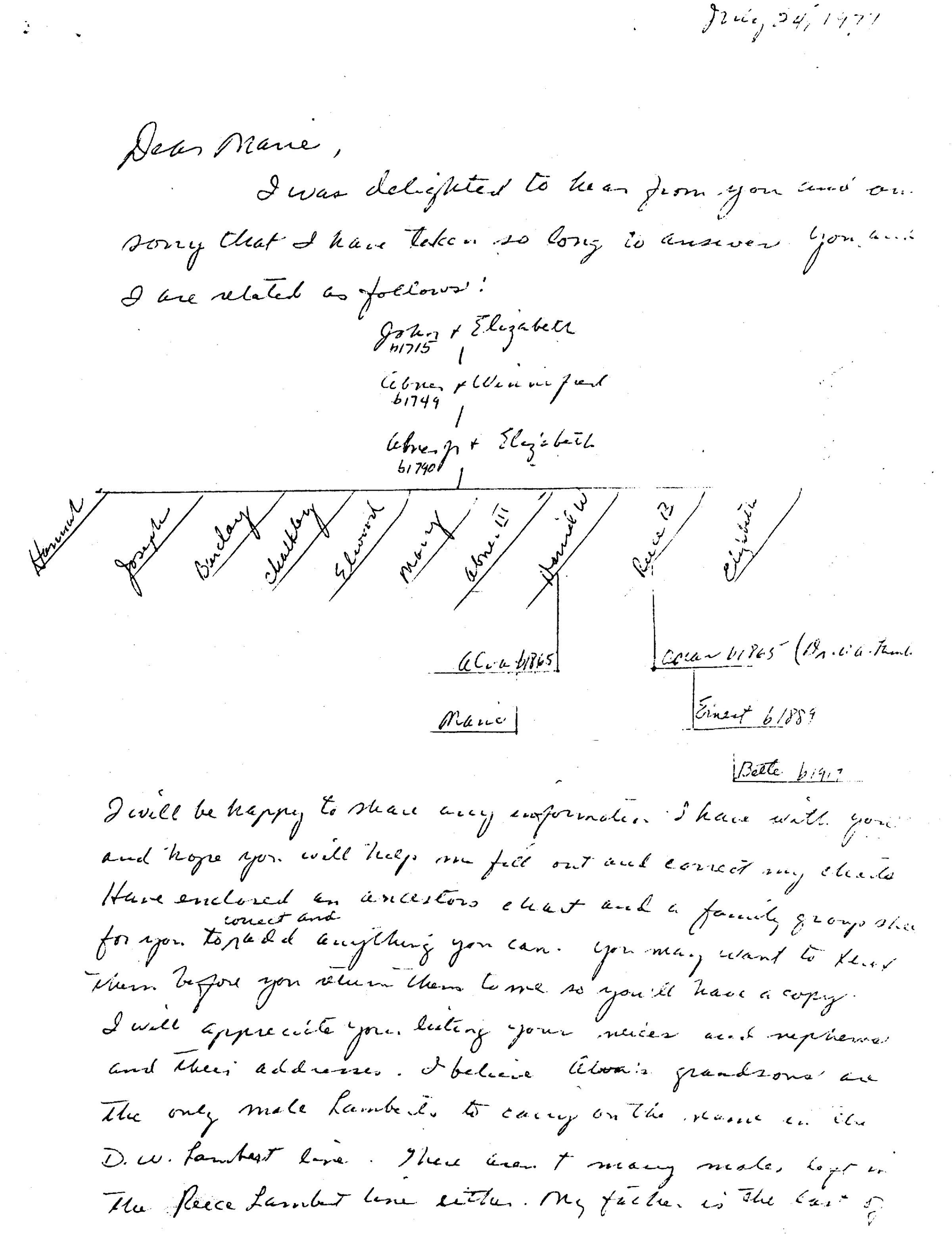 I will be happy to share any information I have with you and hope you will help me fill out and correct my charts. Have enclosed an ancestors chart and a family group sheet for you to correct and add anything you can. You may want to xerox them before you return them to me so you'll have a copy. I will appreciate you listing your nieces and nephews and their addresses. I believe Alva's grandsons are the only male Lamberts to carry on the name in the D. W. Lambert line. There aren't many males left in the Reece Lambert line either. My father is the last of