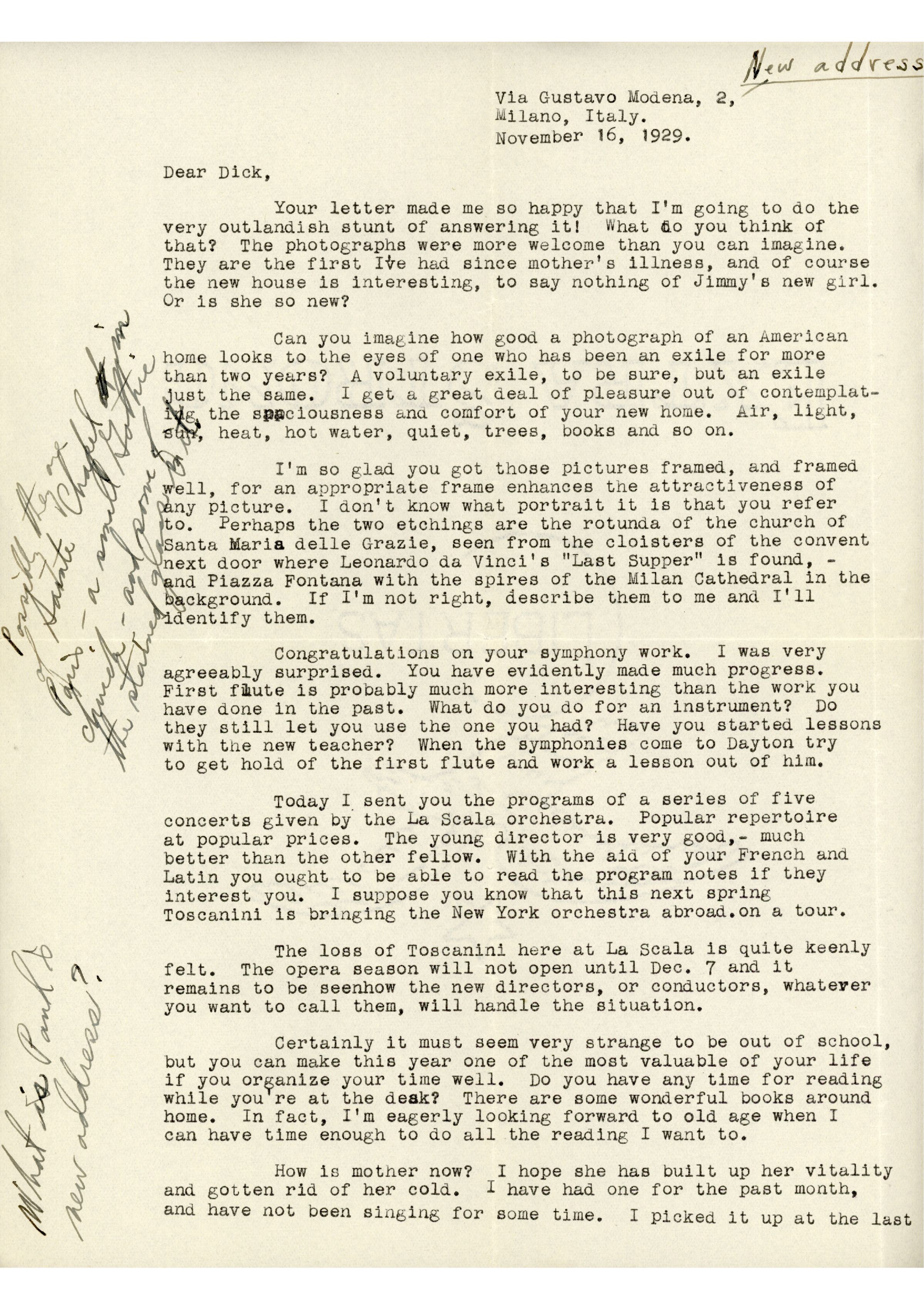 Today I sent you the programs of a series of five concerts given by the La Scala orchestra. Popular repertoire at popular prices. The young director is very good, - much better than the other fellow. With the aid of your French and Latin you ought to be able to read the program notes if they interest you. I suppose you know that this next spring Toscanini is bringing the New York orchestra abroad on tour.