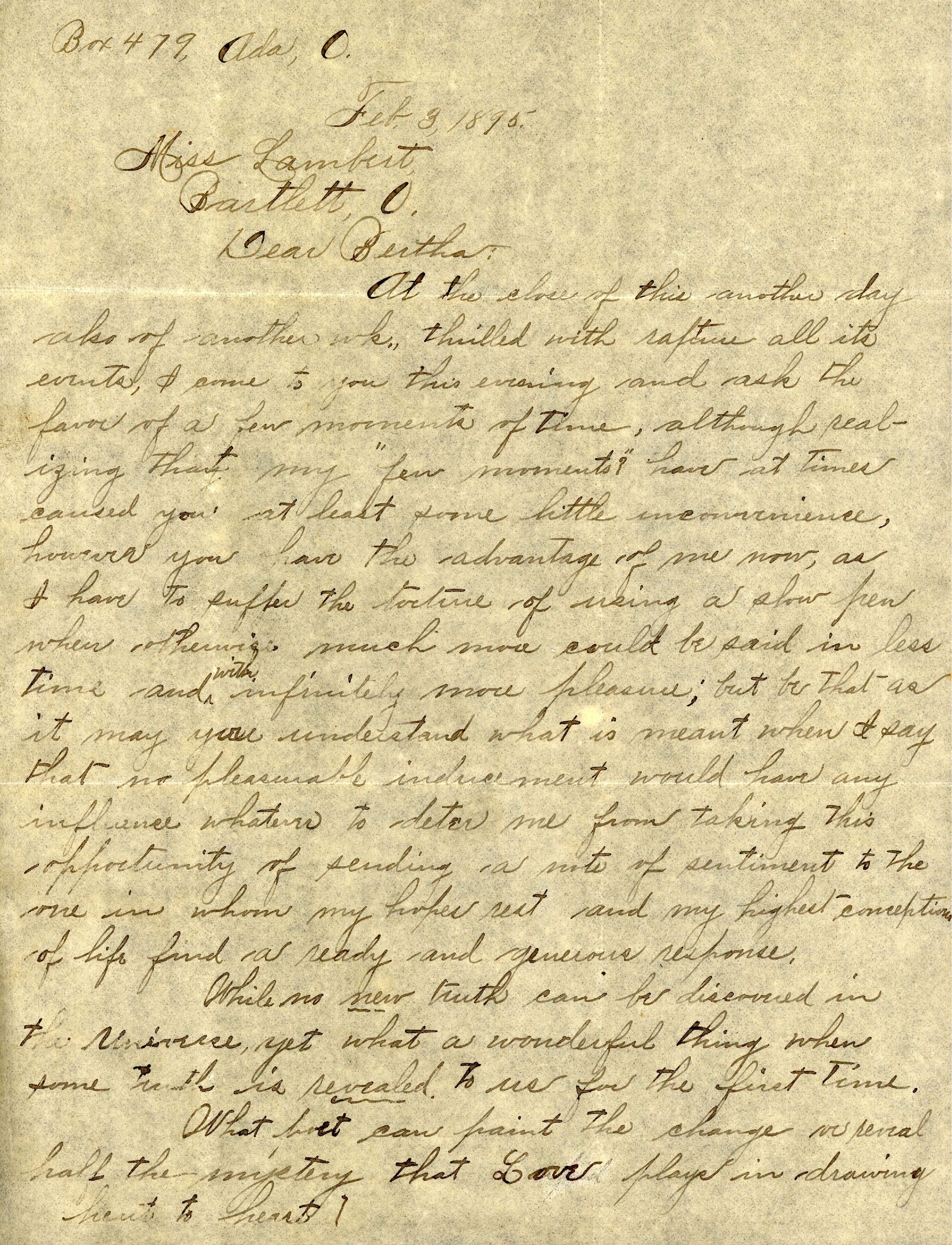 [Ada, OH, to Miss Bertha E. Lambert, Bartlett, Ohio, “Washington Co.”]