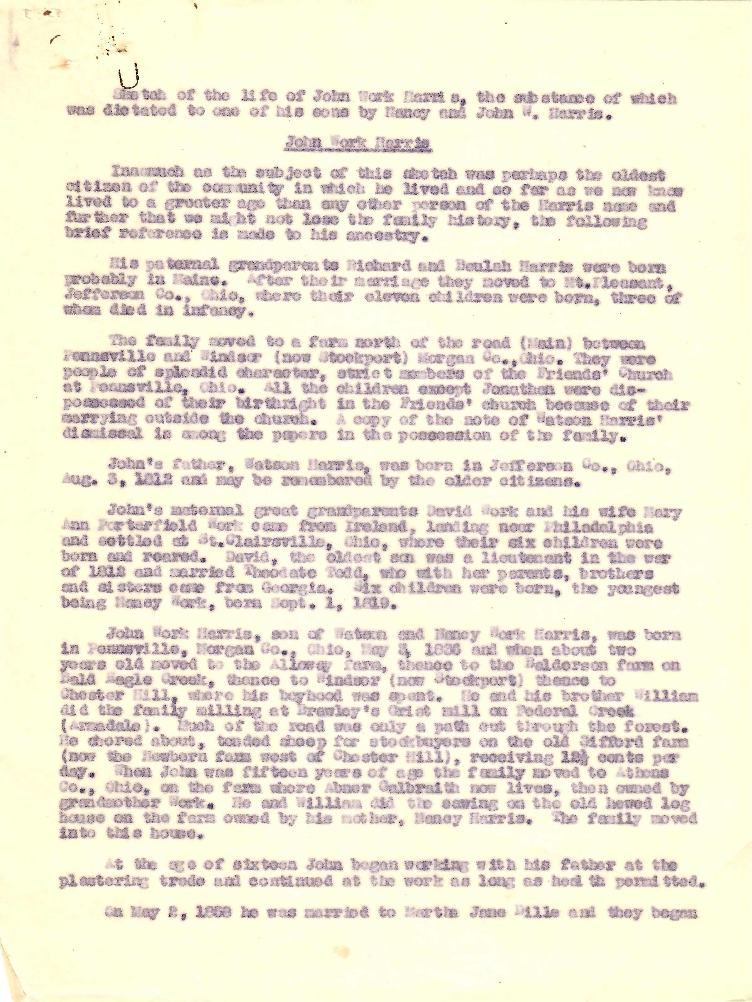 John Work Harris, son of Watson and Nancy Work Harris, was born in Pennsville, Morgan County, Ohio, May 3, 1836 and when about two years old moved to the Alloway farm, thence to the Balderson farm on Bald Eagle Creek, thence to Windsor (now Stockport), thence to Chester Hill where his boyhood was spent. He and his brother, William, did the family milling at Brawley's Grist Mill on Federal Creek (Armadale). Much of the road was only a path cut through the forest. He chored about tended sheep for stockbuyers on the old Gifford farm (now the Newbern farm west of Chester Hill) receiving 12 1/2 cents per day. When John was fifteen years of age the family moved to Athens County on the farm where Abner Galbraith now lives, then owned by grandmother Work. He and William did the sawing on the old hewed log house on the farm owned by his mother, to which the family moved.