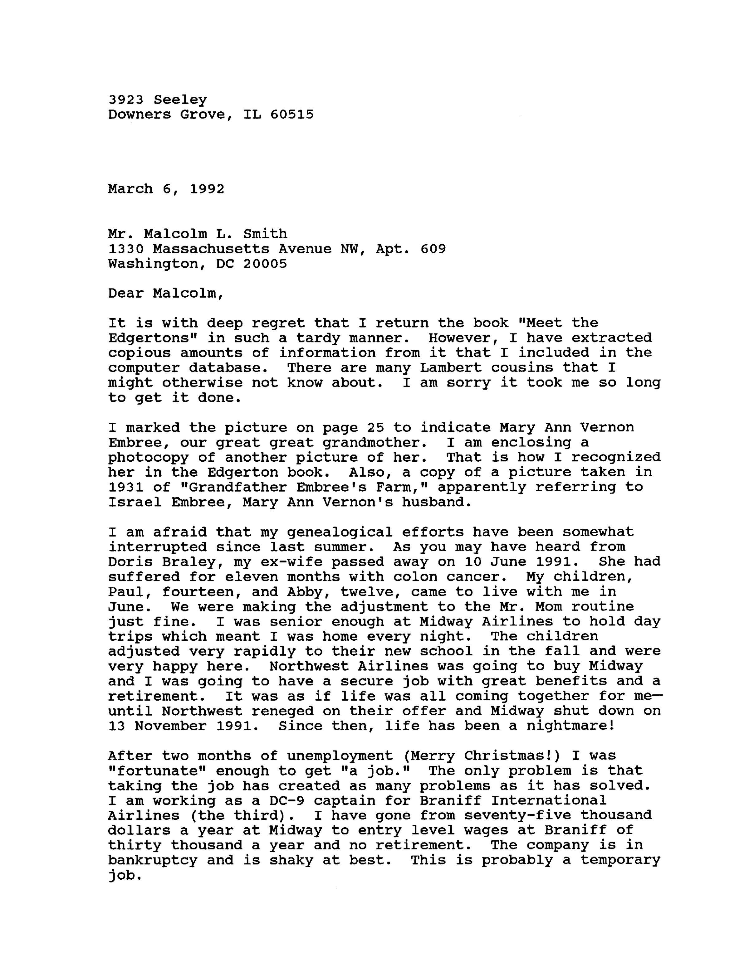 I am afraid that my genealogical efforts have been somewhat interrupted since last summer. As you may have heard from Doris Braley, my ex-wife passed away on 10 June 1991. She had suffered for eleven months with colon cancer. My children, Paul, fourteen, and Abby, twelve, came to live with me in June. We were making the adjustment to the Mr. Mom routine just fine. I was senior enough at Midway Airlines to hold day trips which meant I was home every night. The children adjusted very rapidly to their new school in the fall and were very happy here. Northwest Airlines was going to buy Midway and I was going to have a secure job with great benefits and a retirement. It was as if life was all coming together for me—-until Northwest reneged on their offer and Midway shut down on 13 November 1991. Since then, life has been a nightmare!