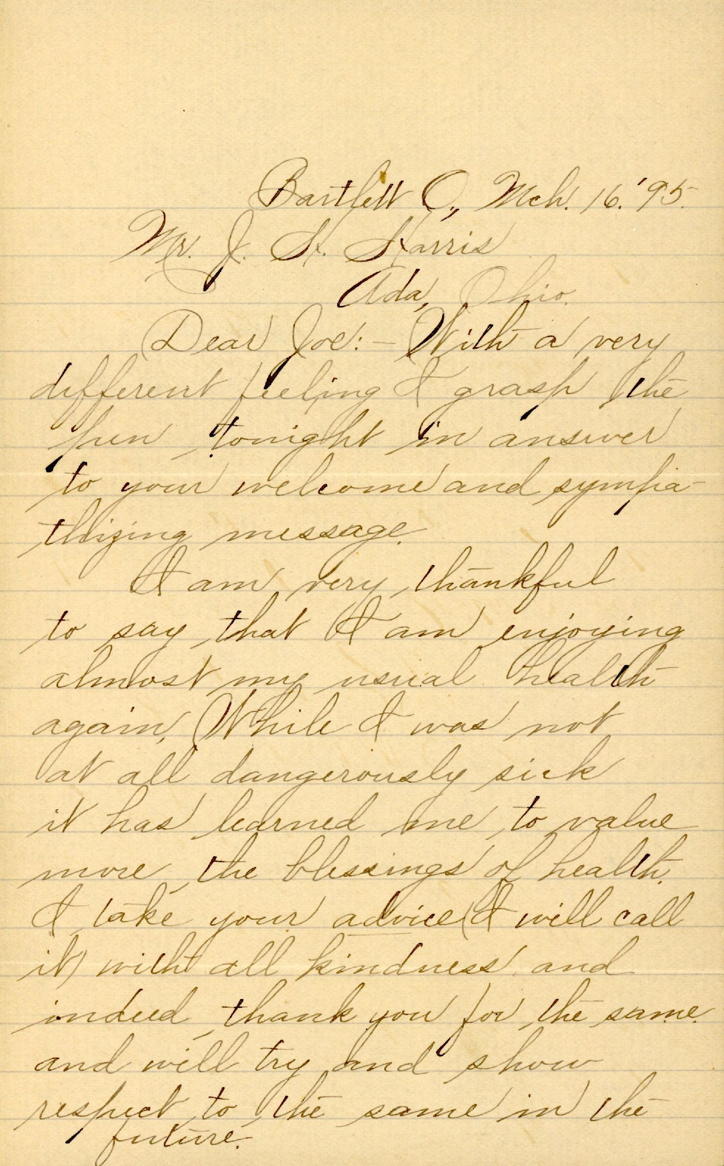 [Bartlett, OH, to Mr. J. H. Harris, Ada, Ohio, Box 479]